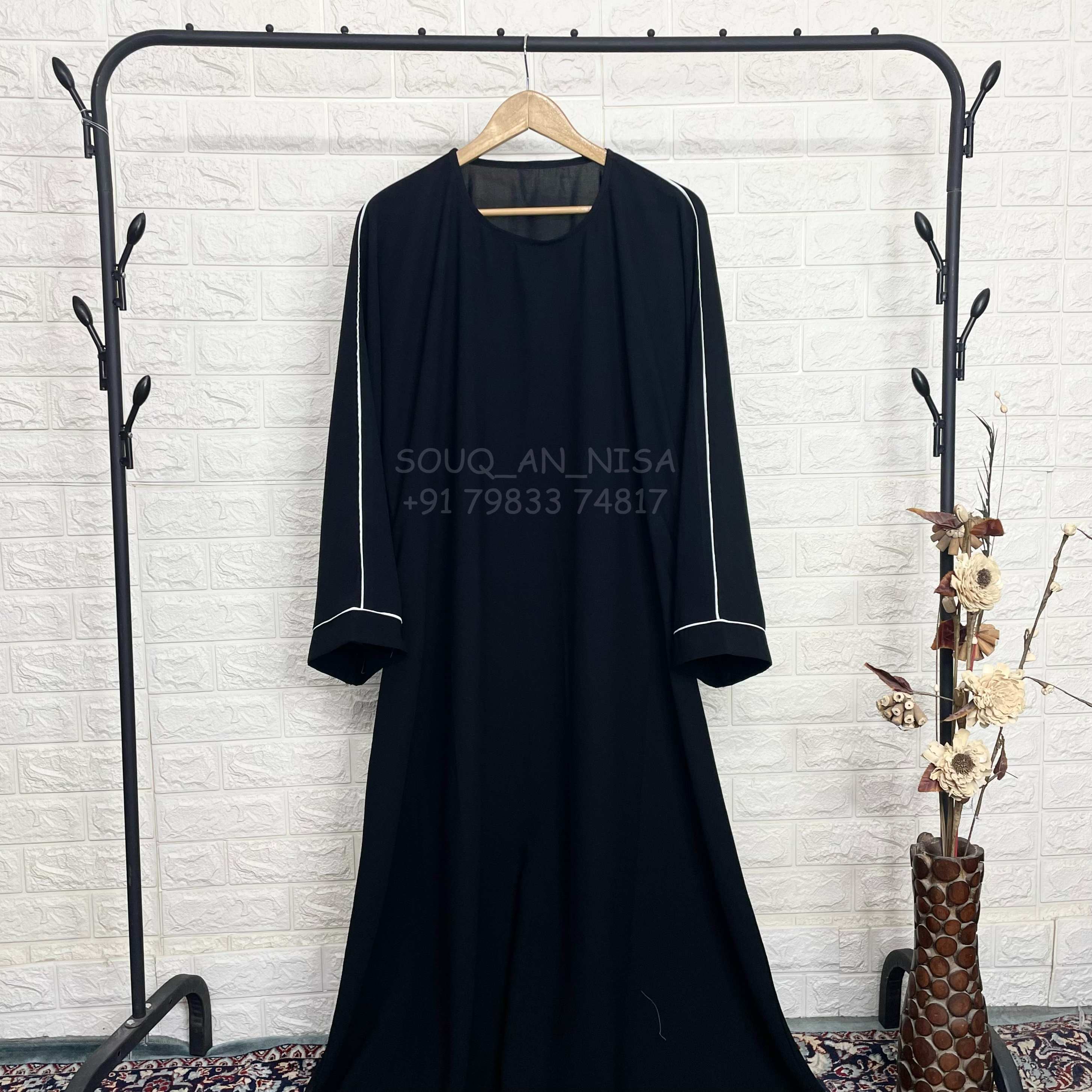 This chic A-line abaya features black contrast piping, adding a sophisticated touch to any outfit. Made with high-quality materials, it effortlessly elevates your style while providing comfort and coverage. Complete your wardrobe with this must-have piece.