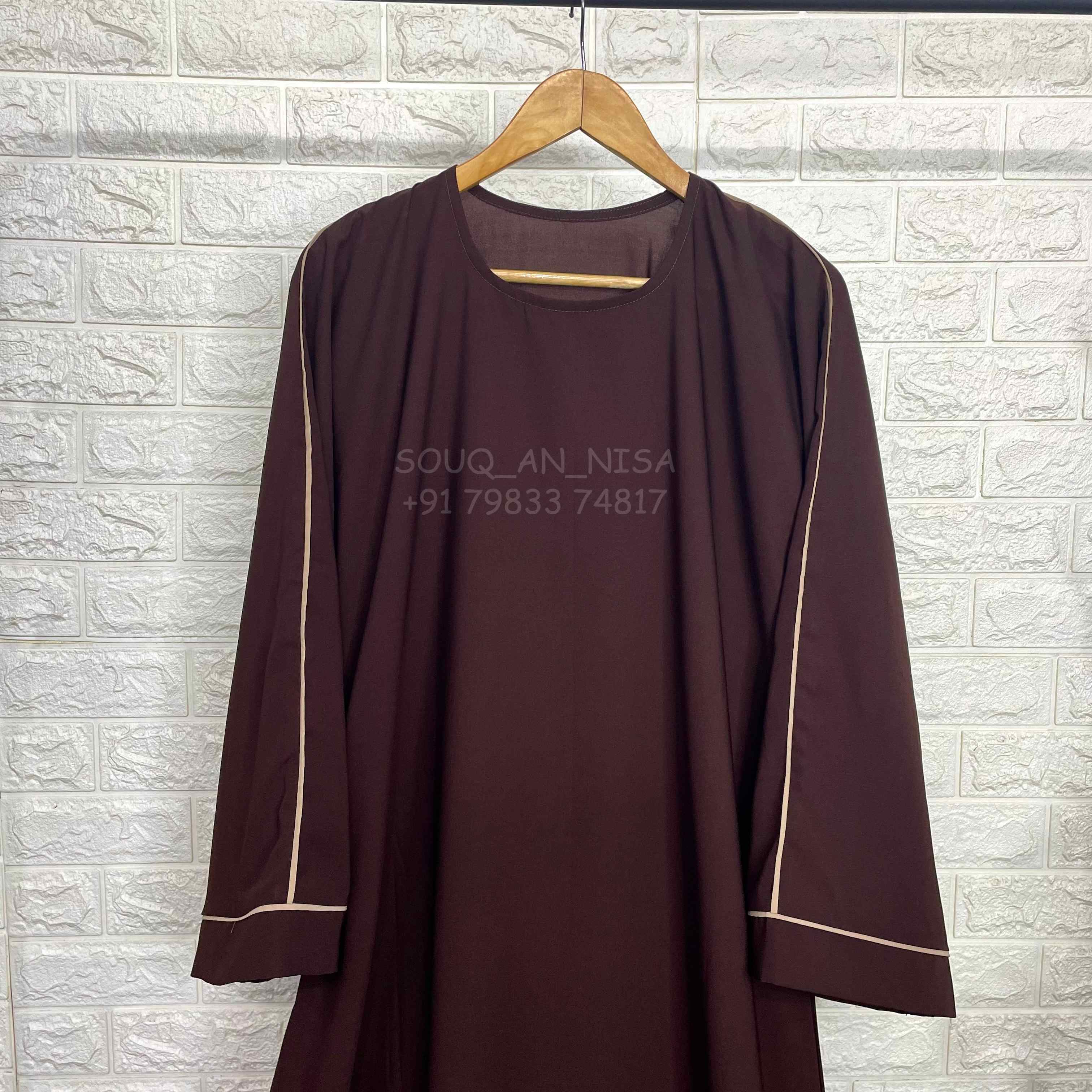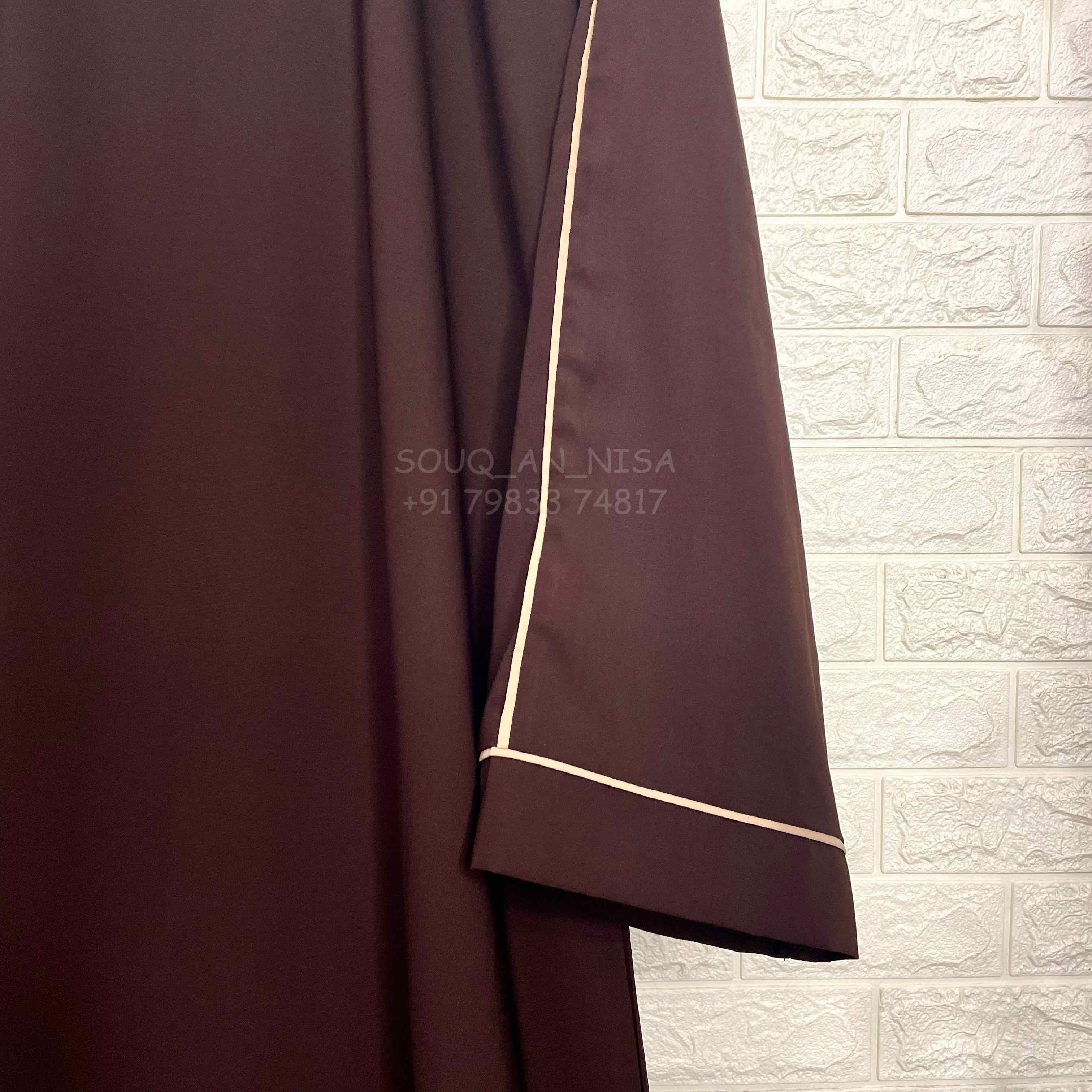 This chic A-line abaya features beige contrast piping, adding a sophisticated touch to any outfit. Made with high-quality materials, it effortlessly elevates your style while providing comfort and coverage. Complete your wardrobe with this must-have piece.