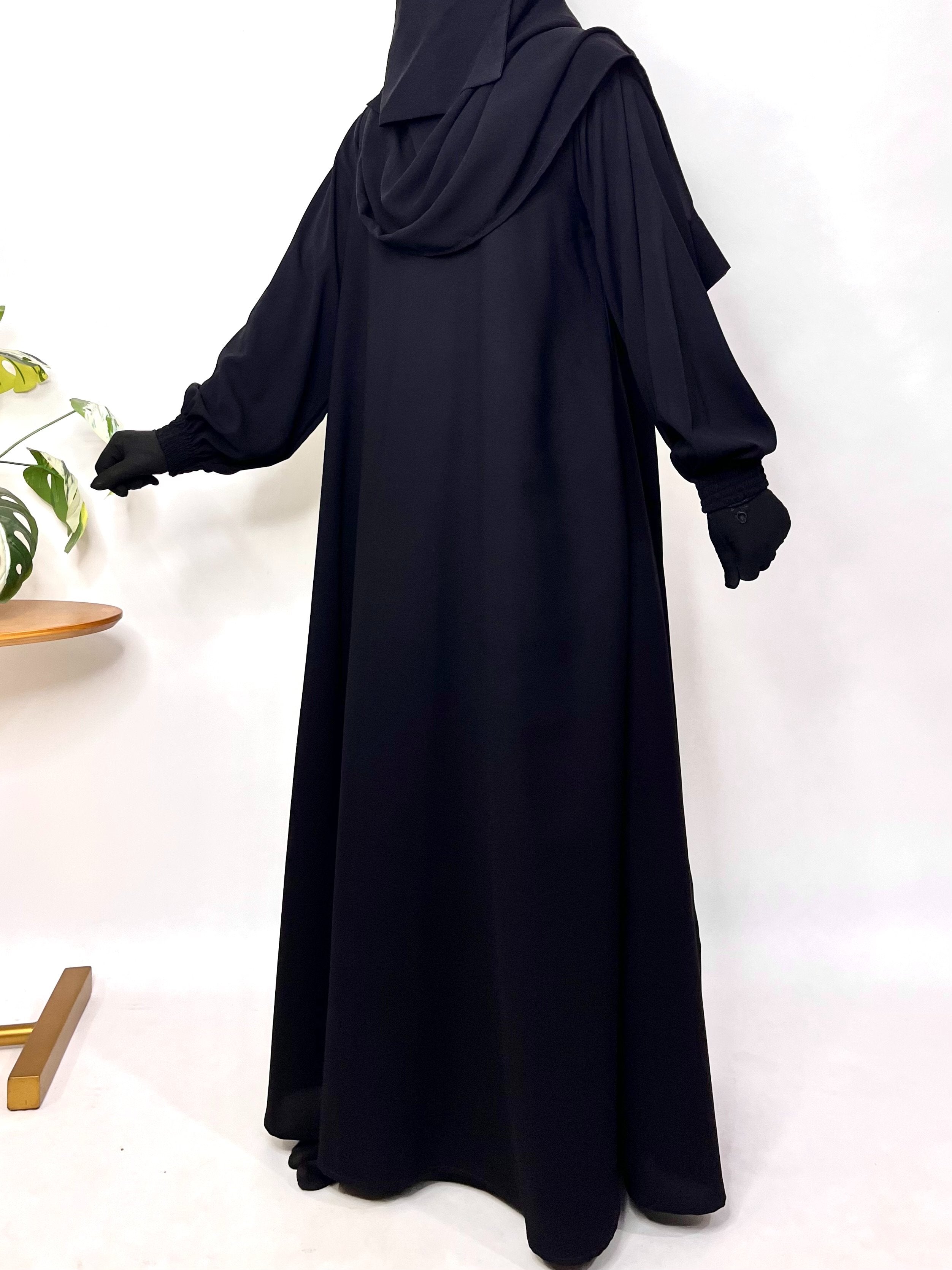 Embrace comfort and grace with this black basic abaya designed to flatter your silhouette. It features elastic sleeves for ease of movement and convenient pockets on both sides. Complete your look with the included black georgette dupatta, finished with matching borders for a refined, coordinated appearance.