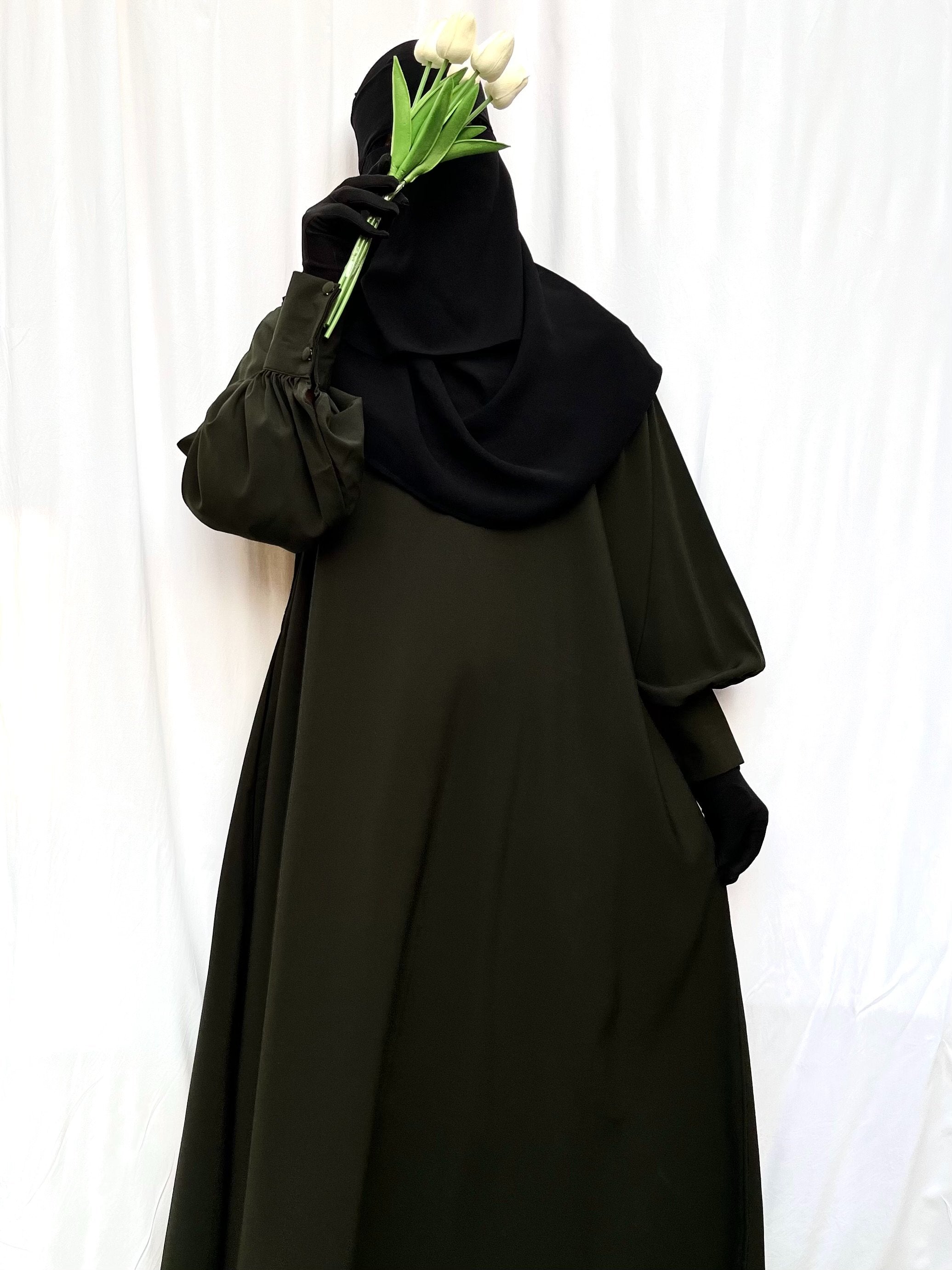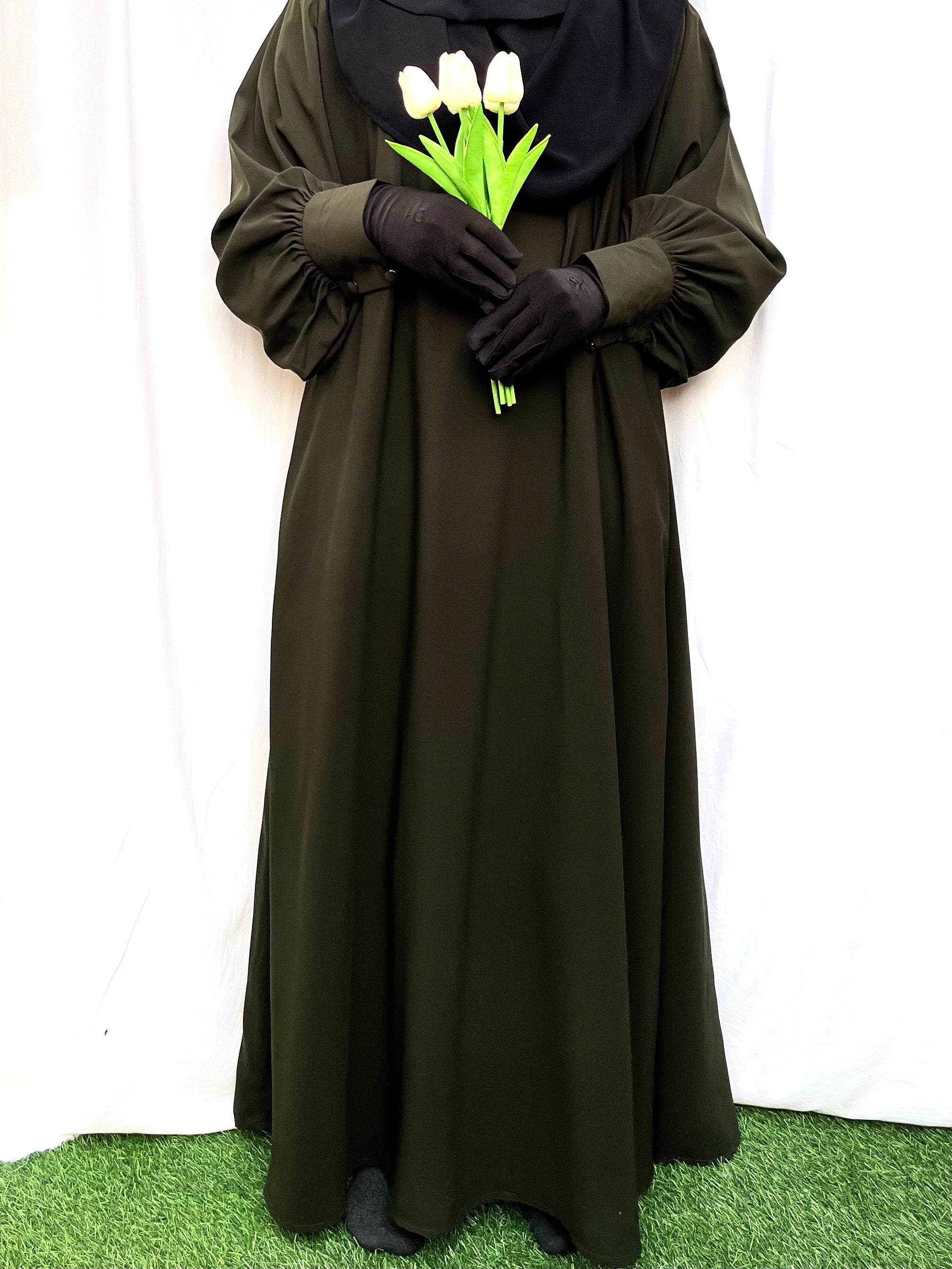 Embrace comfort and grace with this olive basic abaya designed to flatter your silhouette. It features cuff sleeves for ease of movement and convenient pockets on both sides. Complete your look with the included black georgette dupatta, finished with matching borders for a refined, coordinated appearance.