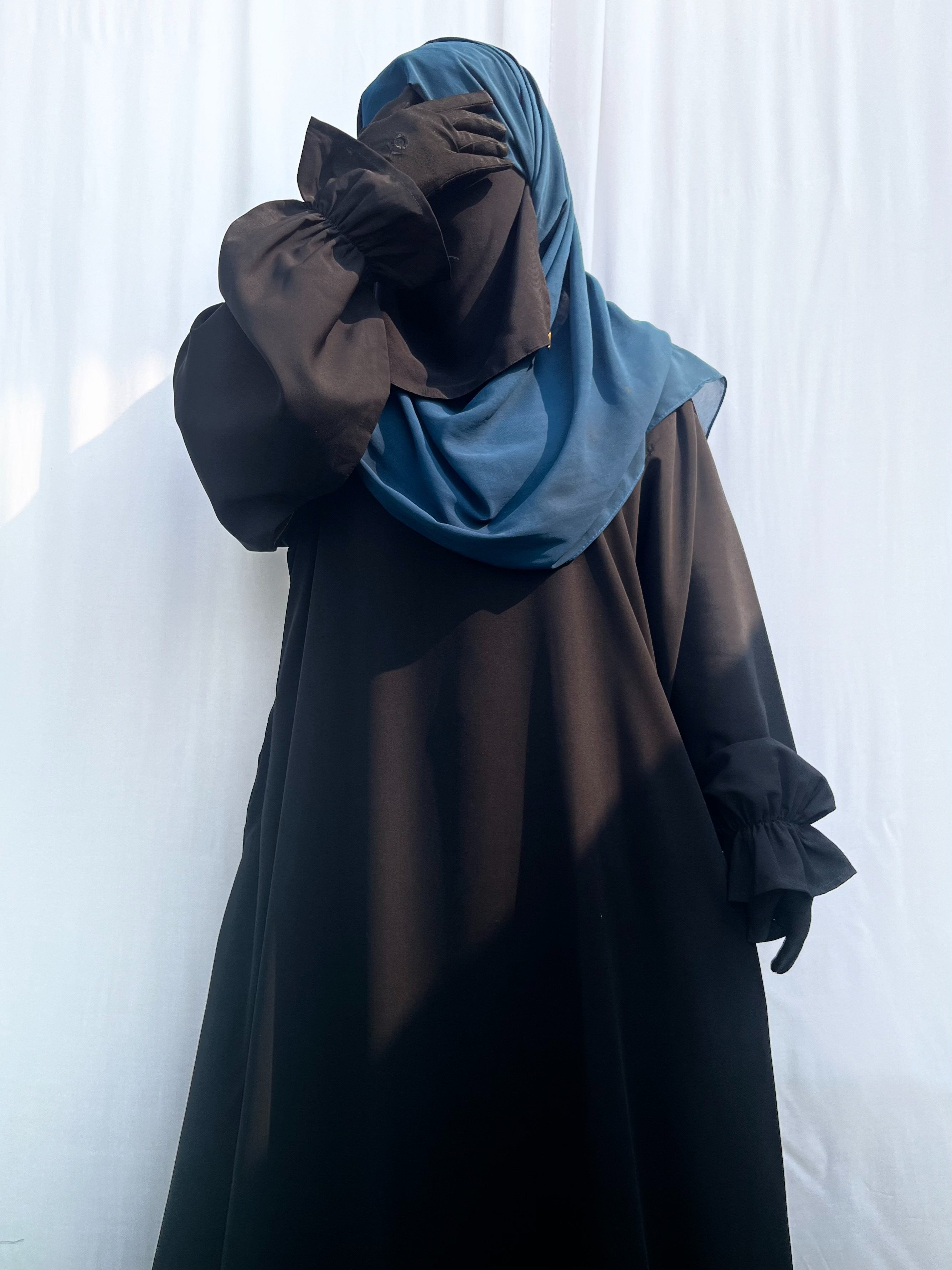 Embrace comfort and grace with this black basic abaya designed to flatter your silhouette. It features flower sleeves for ease of movement and convenient pockets on both sides. Complete your look with the included black georgette dupatta, finished with matching borders for a refined, coordinated appearance.