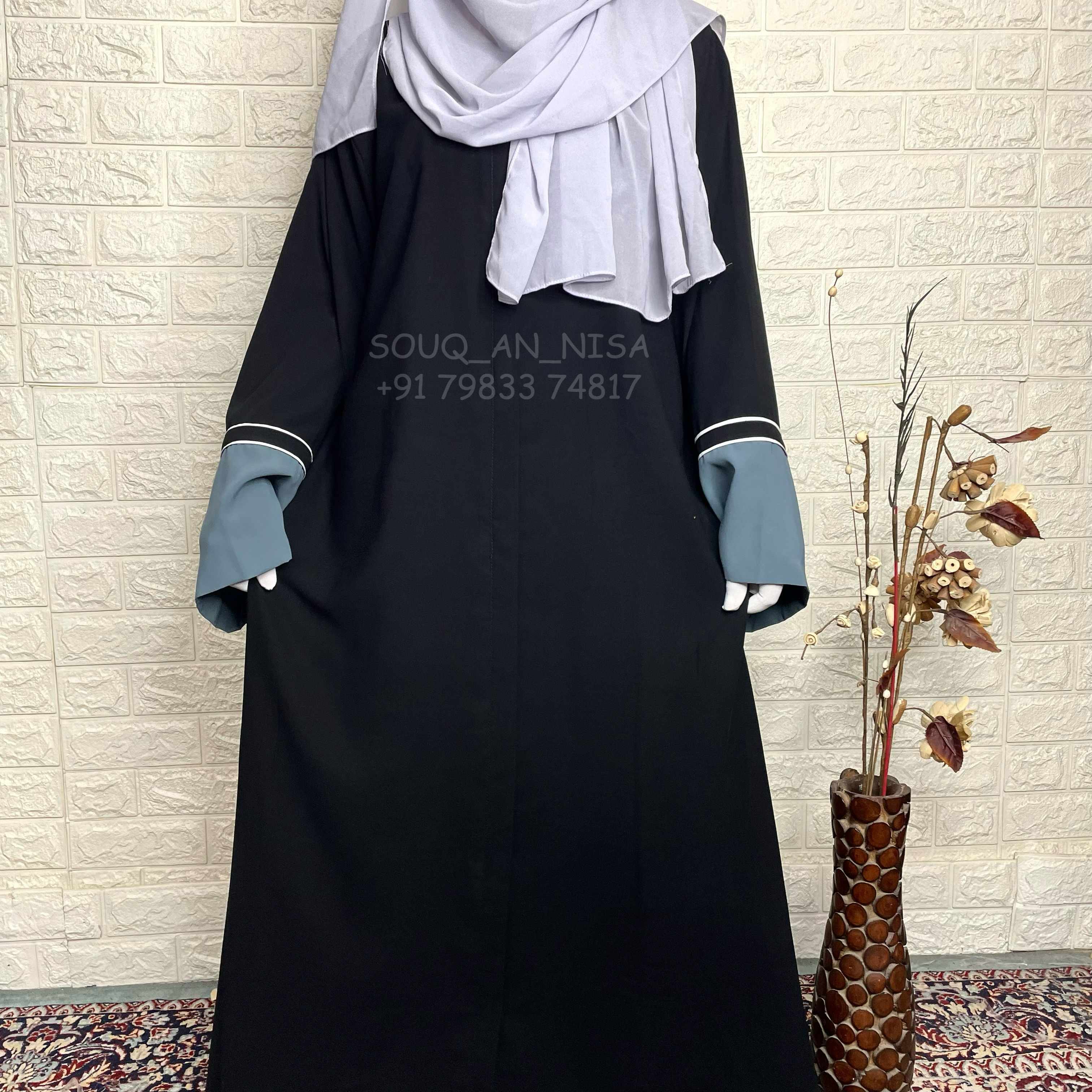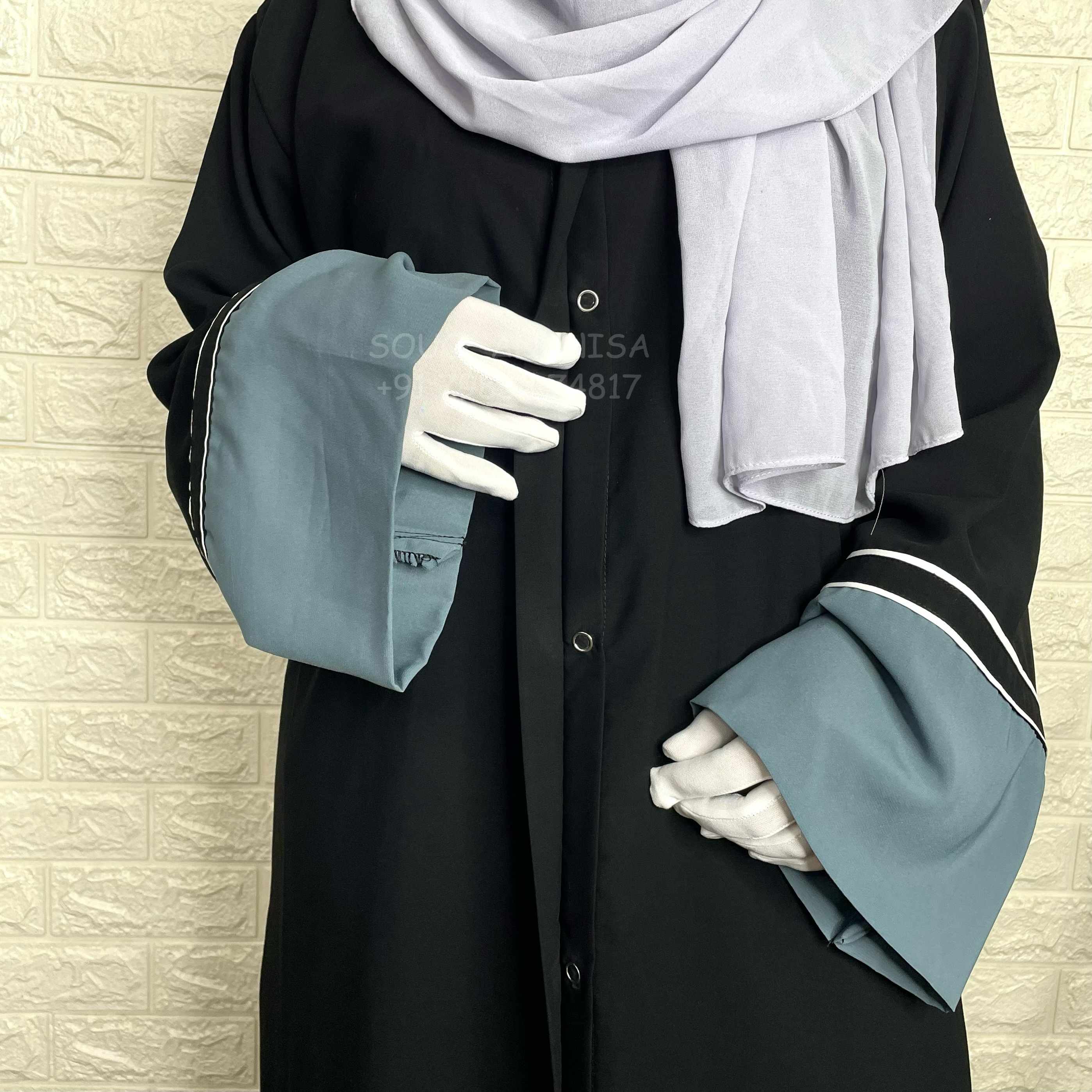 This front open abaya is designed for everyday wear with its broad sleeves and contrasting shade. Its easy-to-wear design makes it perfect for daily use. Stay comfortable and stylish with this versatile piece.