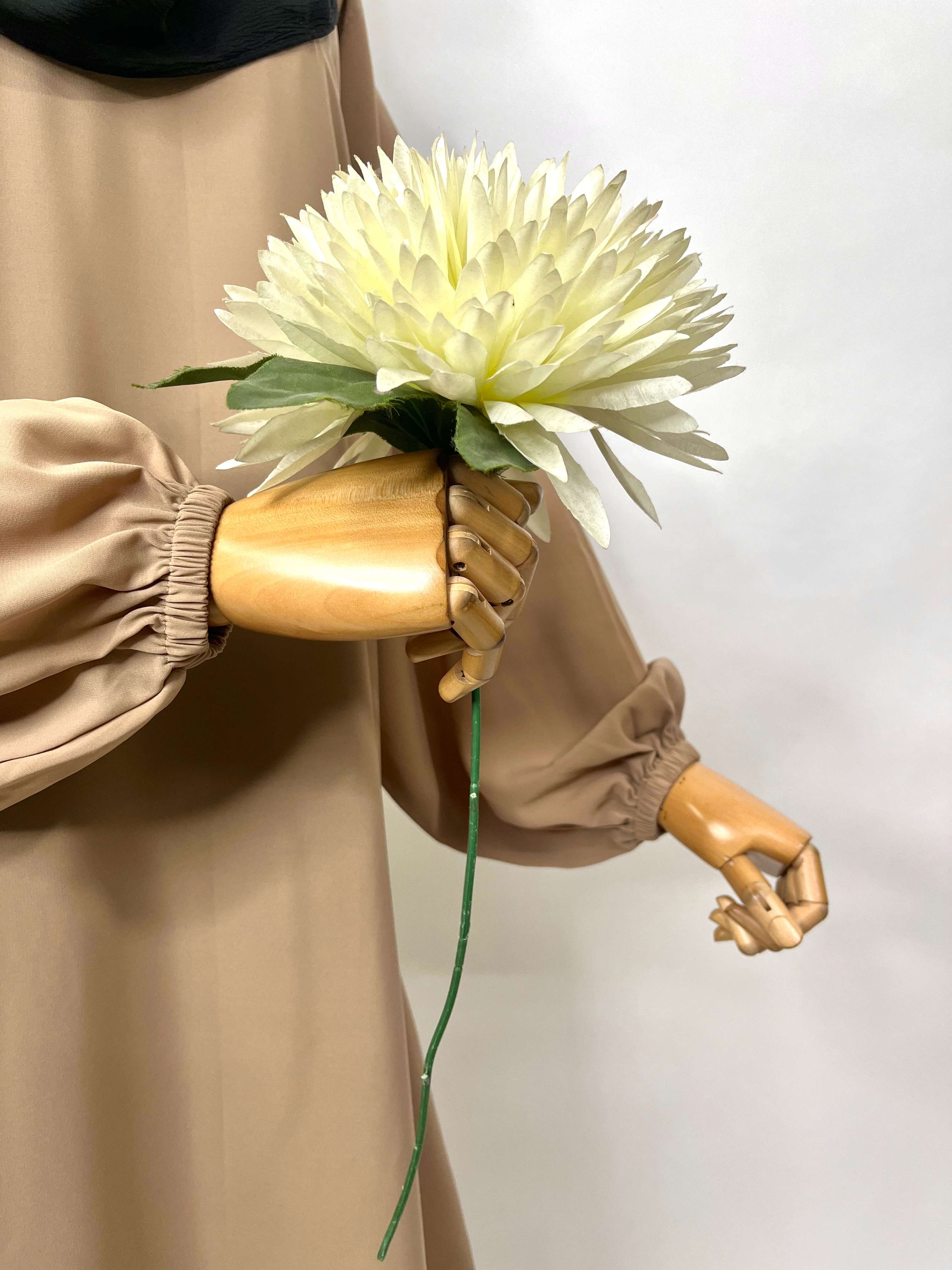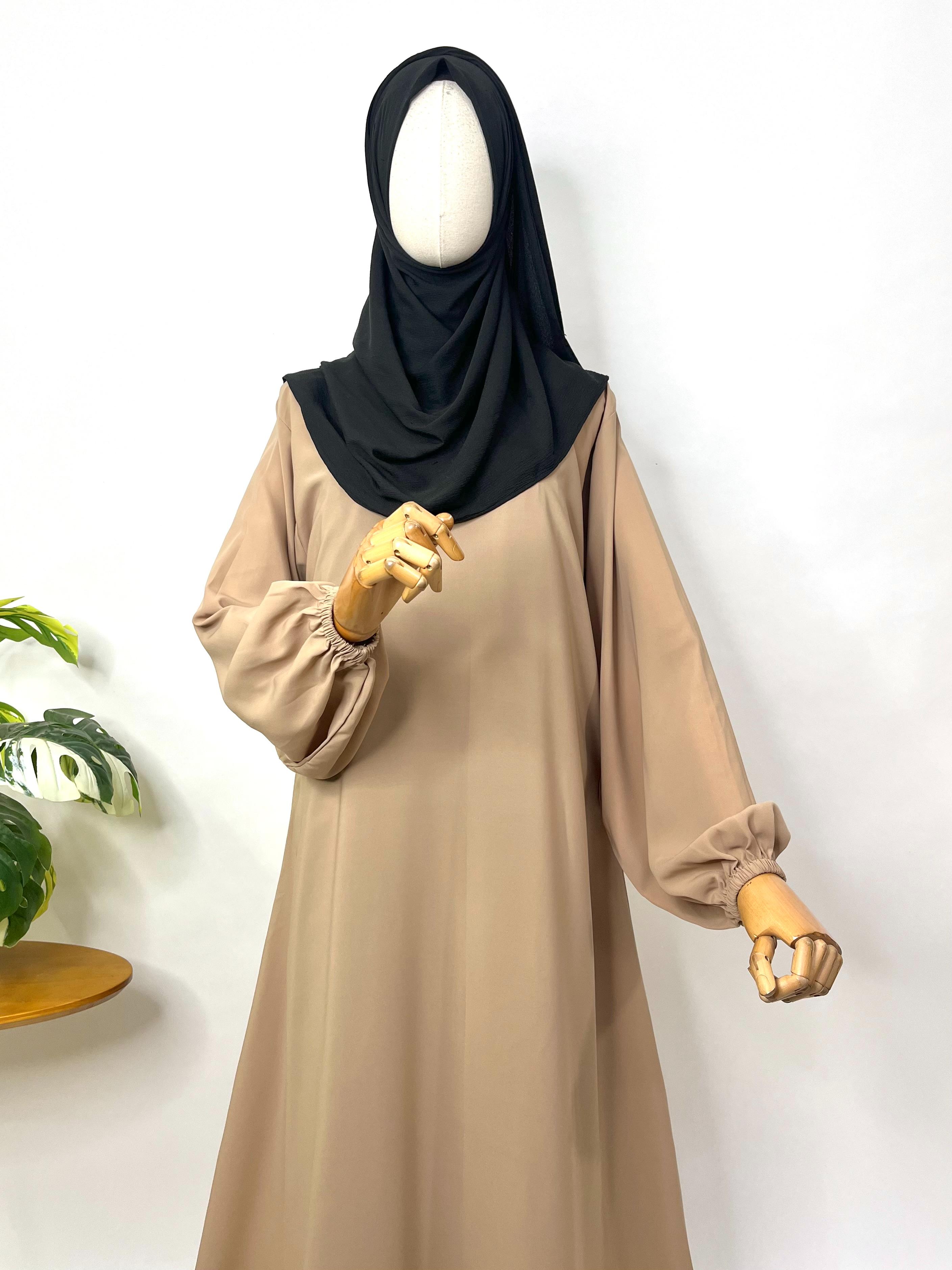 Embrace comfort and grace with this beige basic a-line abaya designed to flatter your silhouette. It features elastic sleeves for ease of movement and convenient pockets on both sides. Complete your look with the included black georgette dupatta, finished with matching borders for a refined, coordinated appearance.