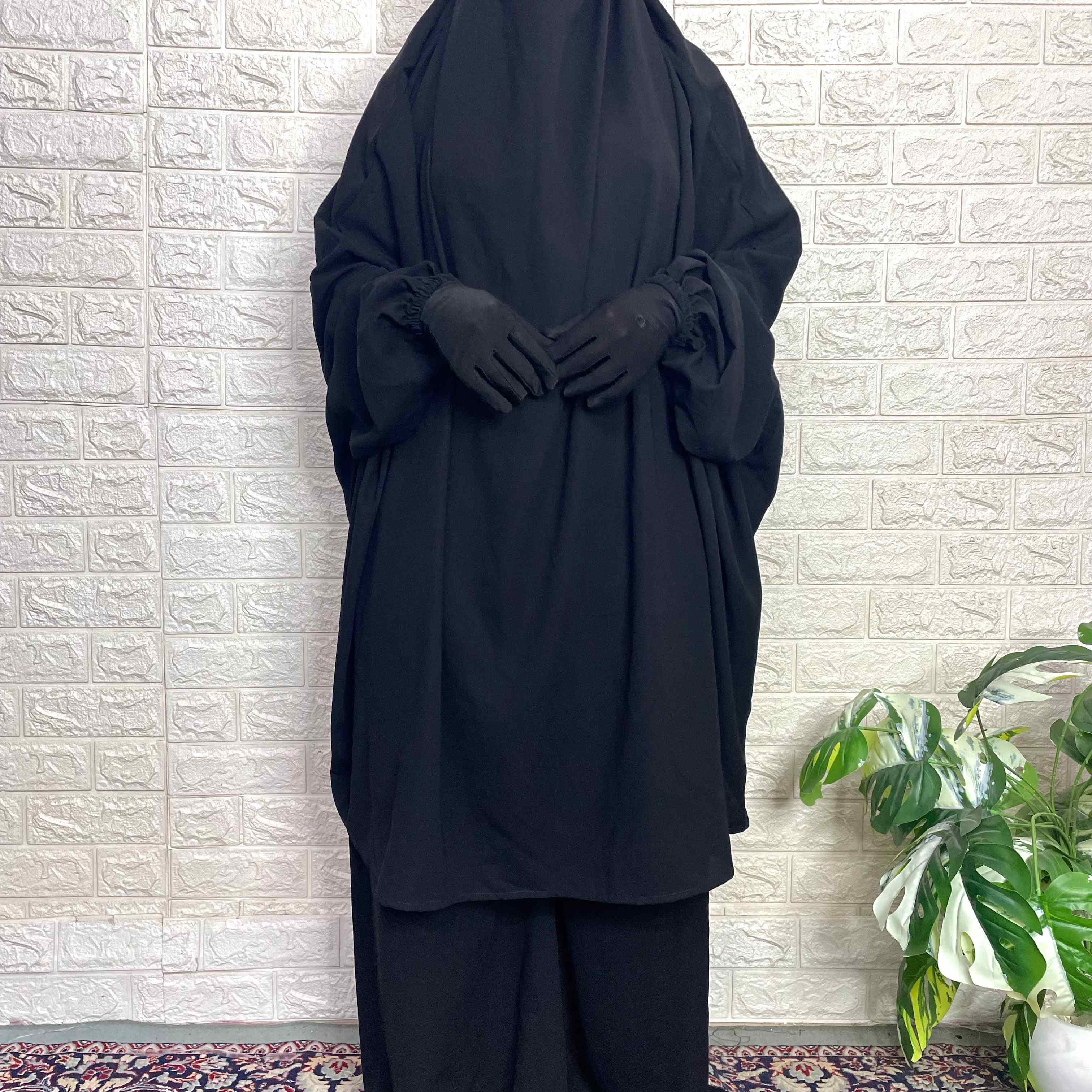 Stay stylish and modest with our Black Two Pc Jilbab. This two piece set includes a broad pant and a jilbab, providing full coverage while keeping you comfortable with elastic sleeves. Perfect for any occasion, this jilbab allows you to stay true to your faith and fashion.