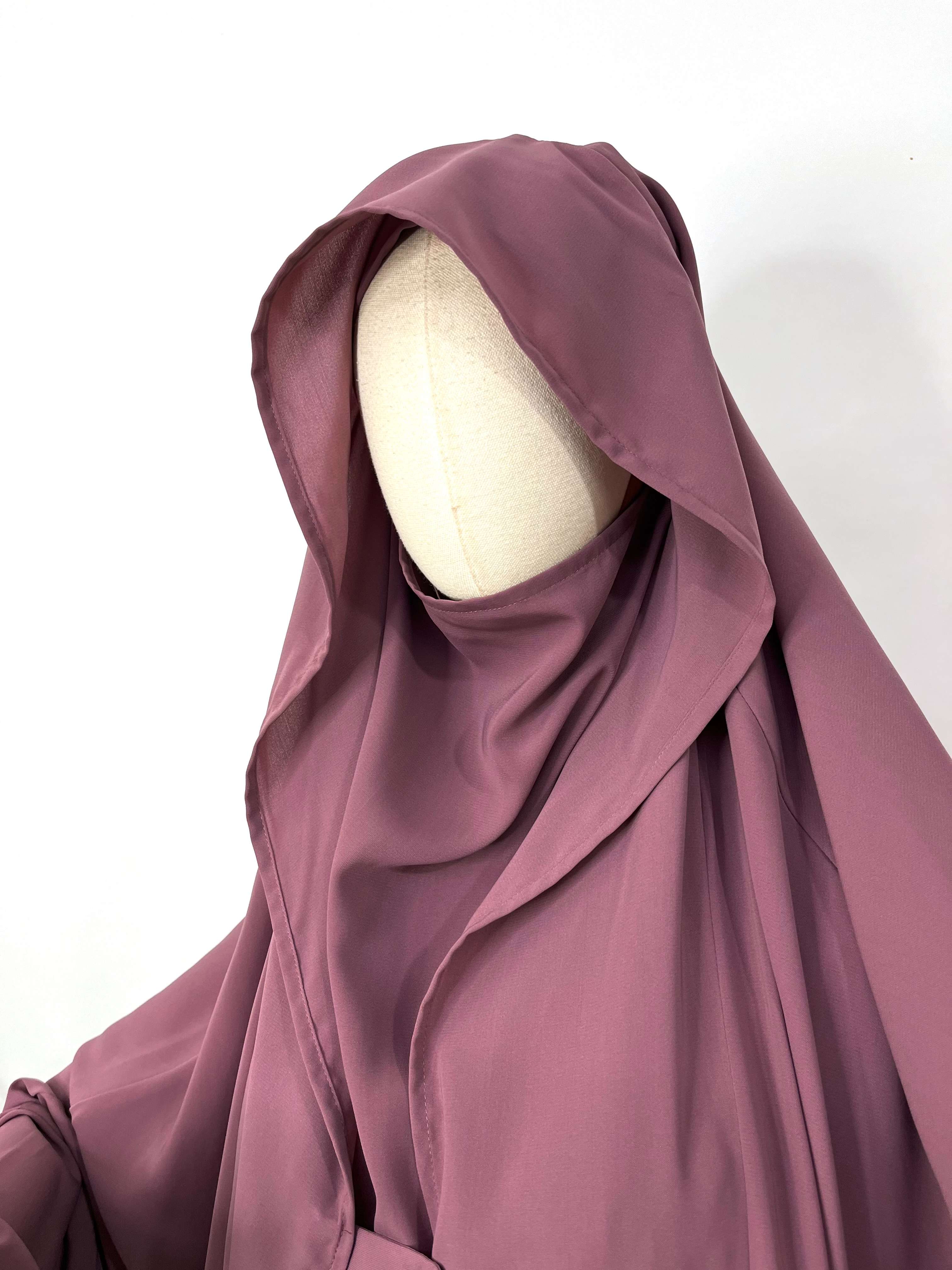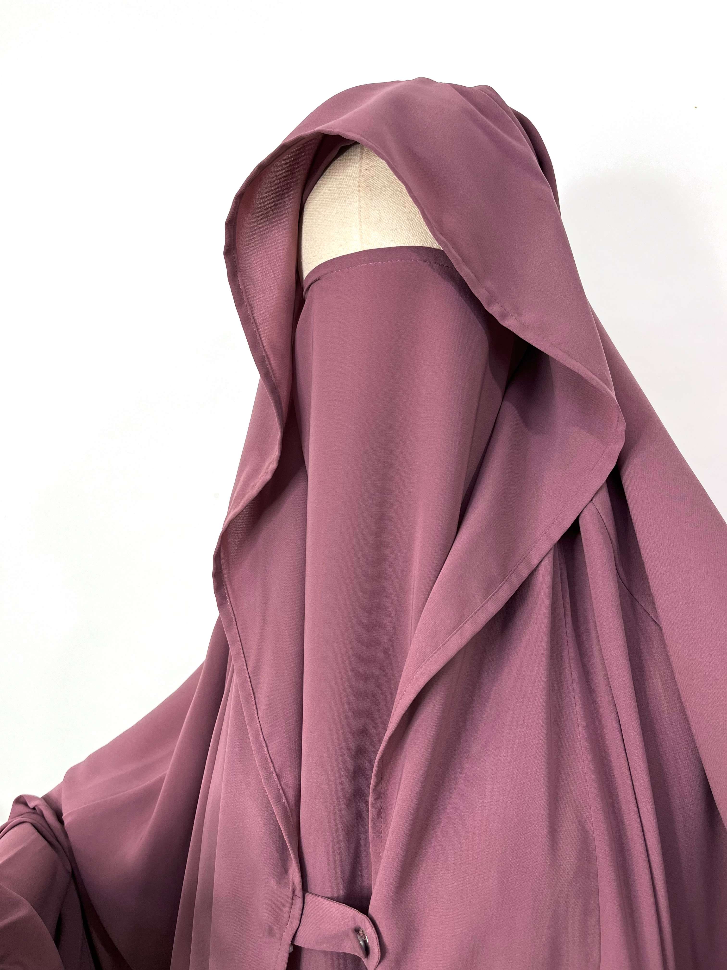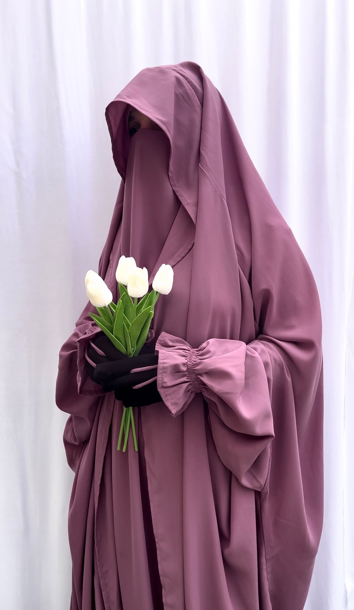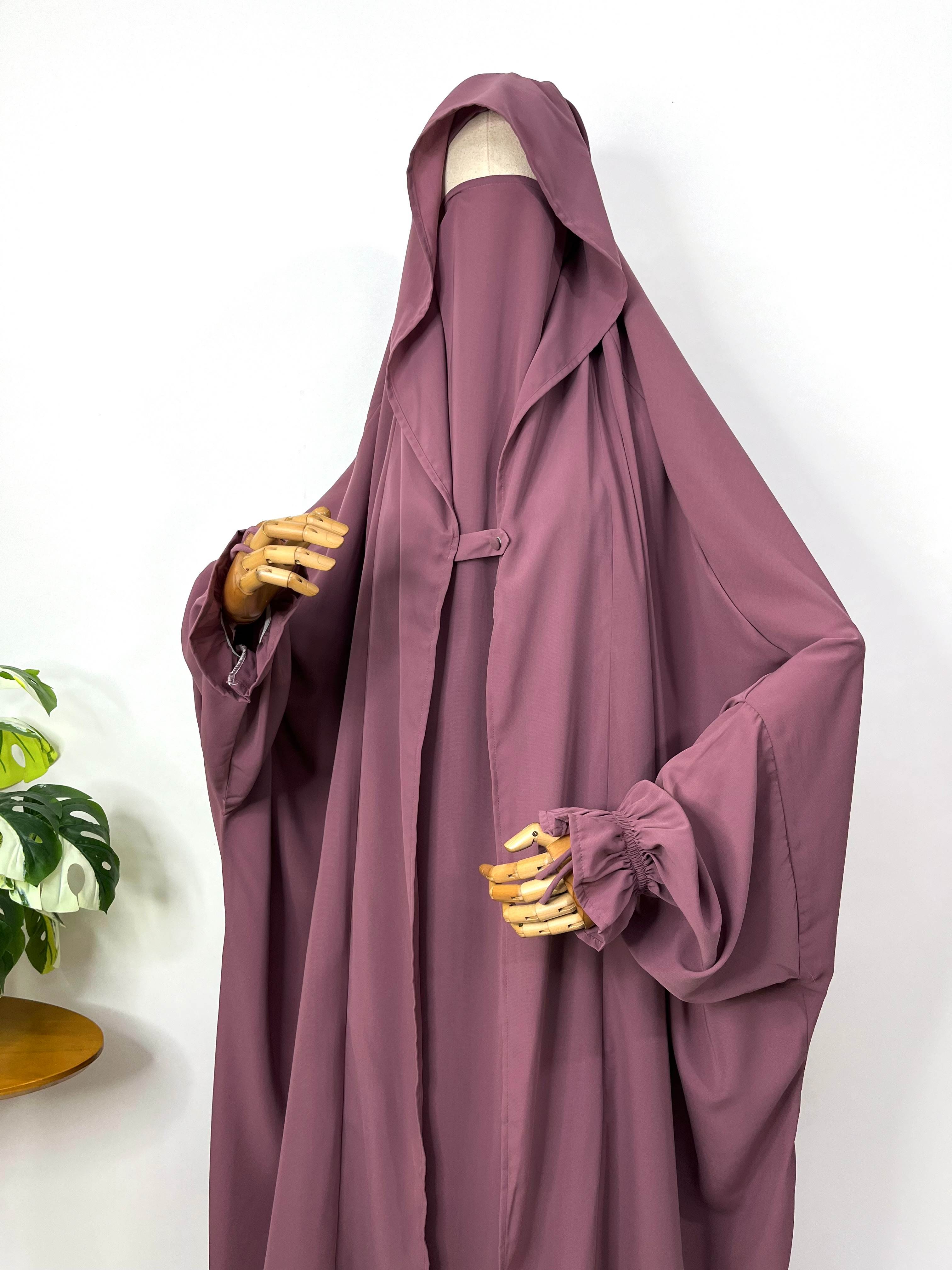 Introducing Dusty mauve Saudi Jilbab with flap - a modest and elegant choice for your wardrobe. This one pc jilbab features a convenient flap design and delicate flower sleeves with loops for added style and ease. Made from high-quality materials, it offers comfort and sophistication in one. Elevate your modest fashion with Saudi Jilbab.