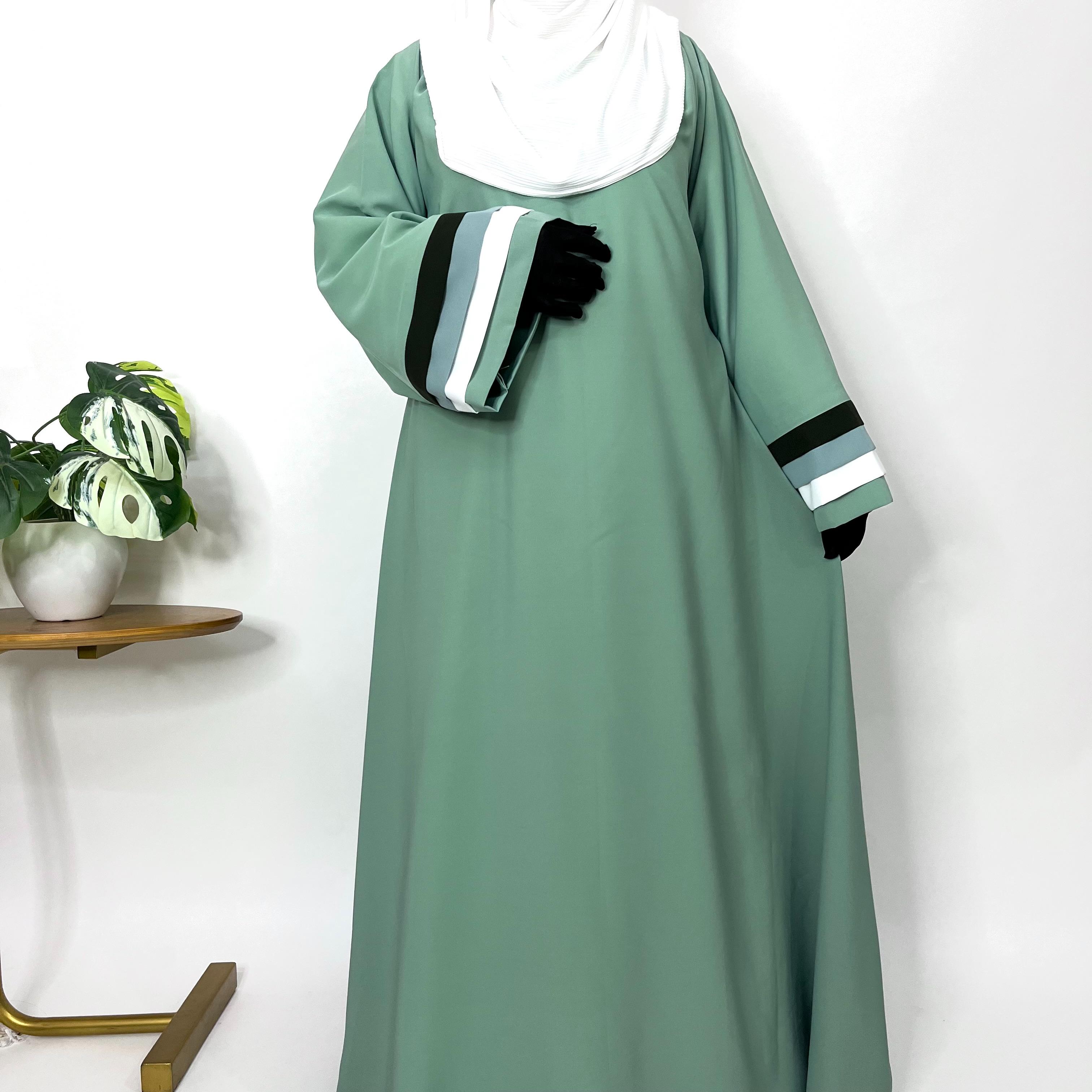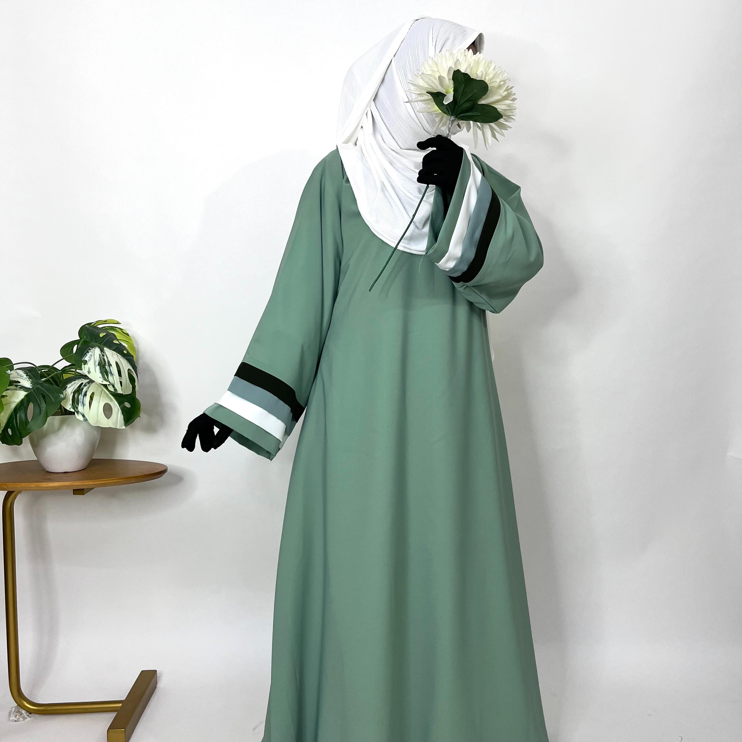 The Iram Abaya features a simple A-line silhouette with three contrasting sleeves, offering a modest yet stylish look. Its design ensures comfort and ease of movement, making it a versatile choice for everyday wear. Perfect for those seeking a blend of tradition and subtle modern flair.