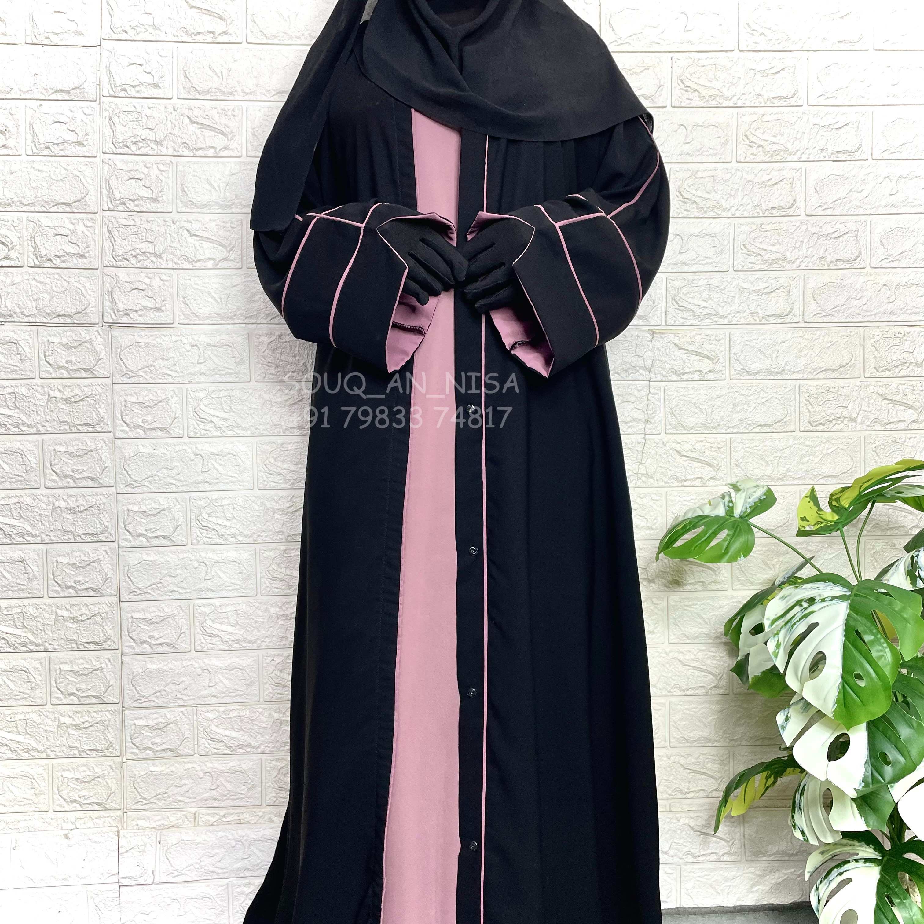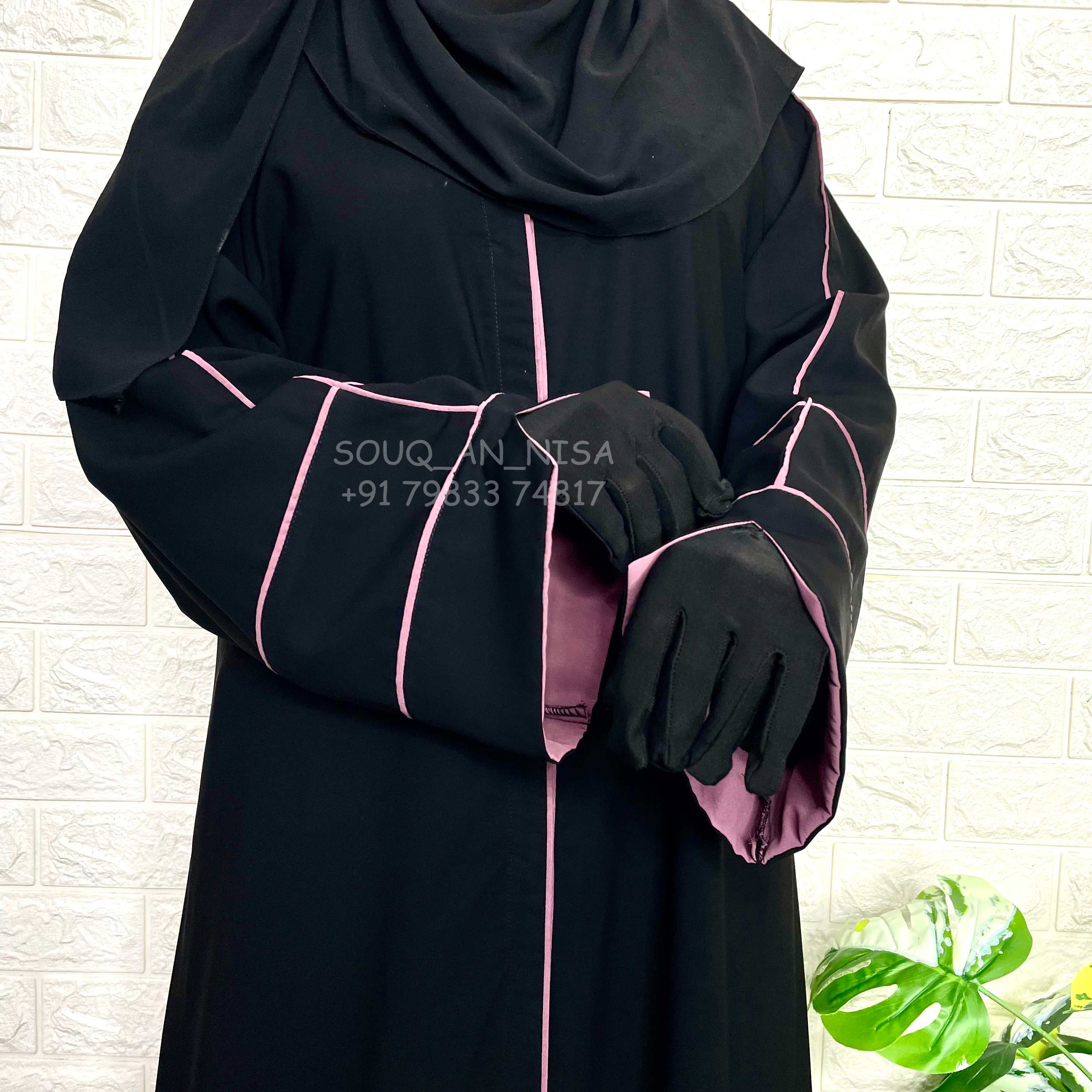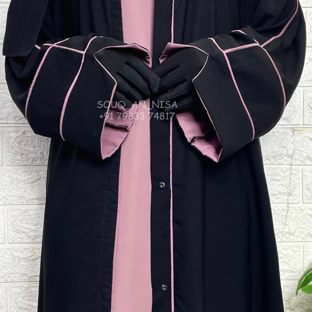 Enhance your style with our black basic abaya with pink piping front open abaya. The front open shrug style adds a modern touch, while the bow sleeves add a feminine and elegant look. Perfect for any occasion, this abaya will elevate your wardrobe effortlessly. Express yourself with confidence while staying modest and stylish.