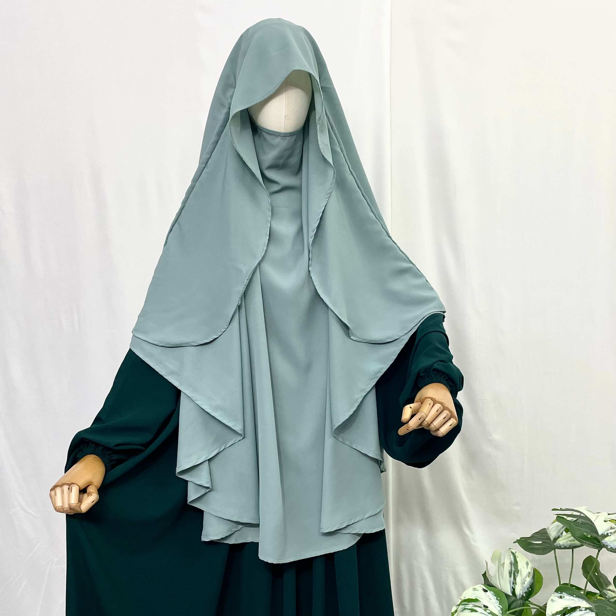 Haya Abaya with Khimar features a rich hunter green abaya paired with a sapphire khimar, creating an elegant and harmonious look. Its flowy design ensures comfort and grace throughout the day, making it a perfect choice for those seeking modesty without compromising style. This set supports your desire for a refined and poised appearance with ease.
