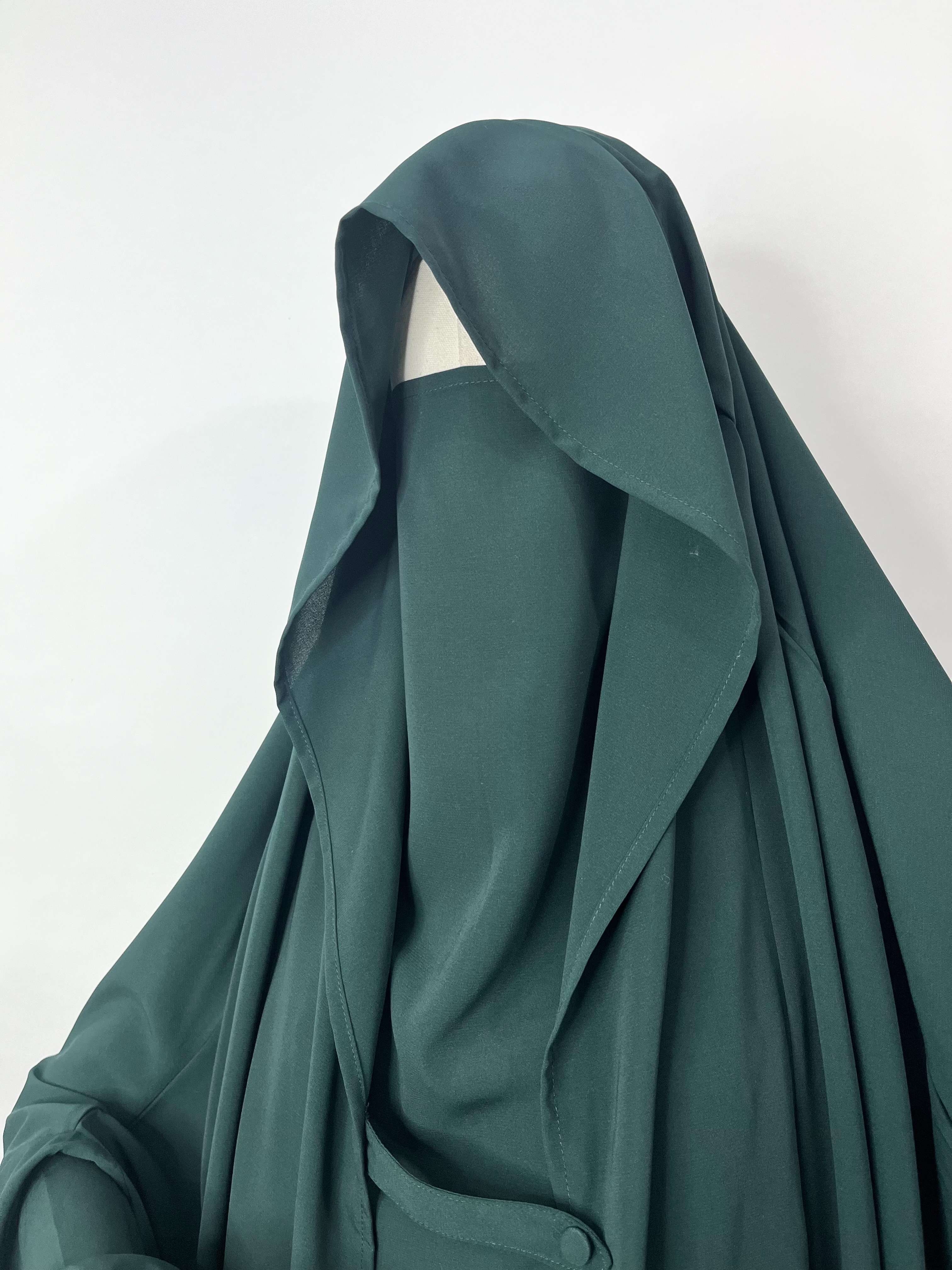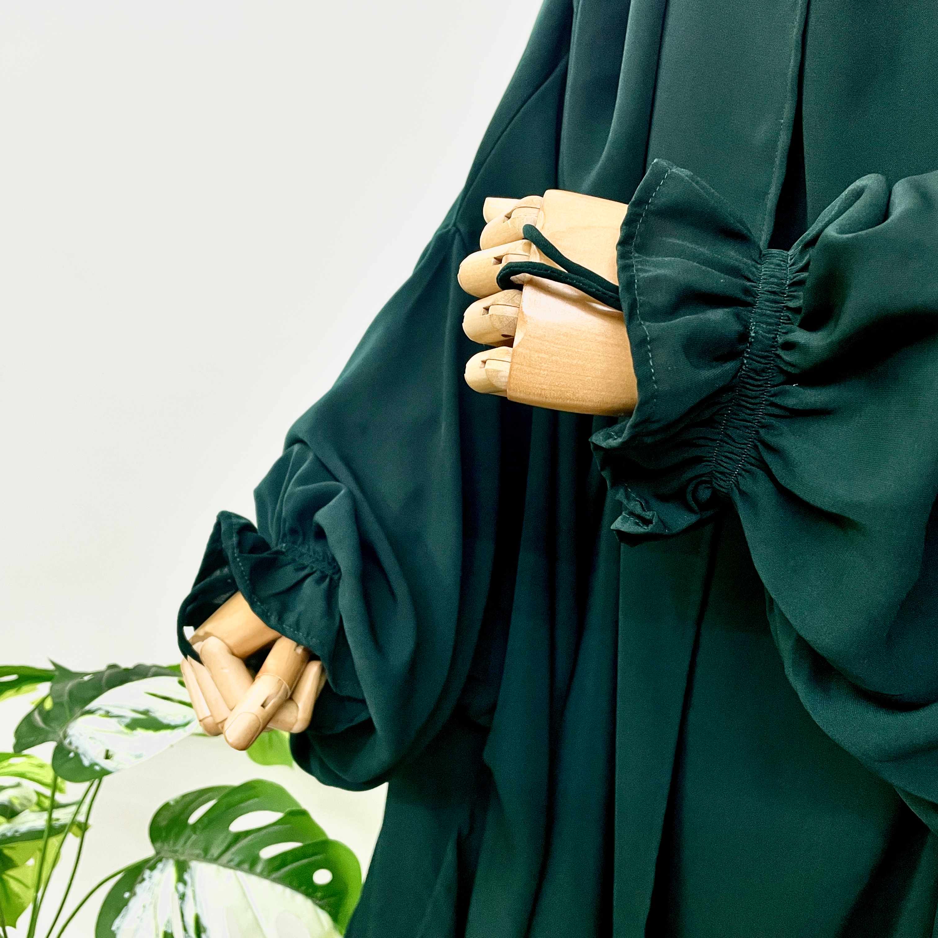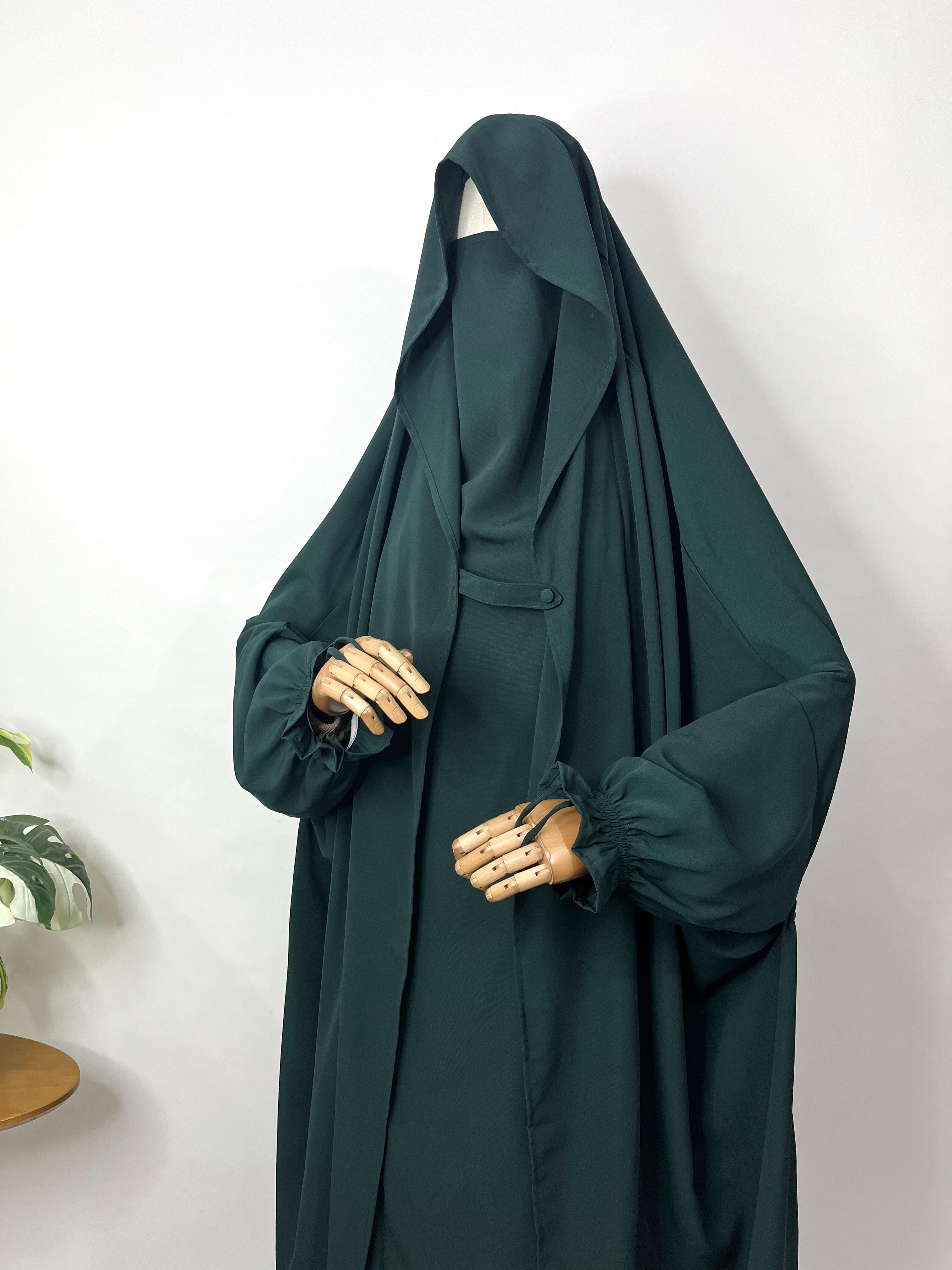 Introducing Saudi Jilbab with flap - a modest and elegant choice for your wardrobe. This one pc jilbab features a convenient flap design and delicate flower sleeves with loops for added style and ease. Made from high-quality materials, it offers comfort and sophistication in one. Elevate your modest fashion with Saudi Jilbab.