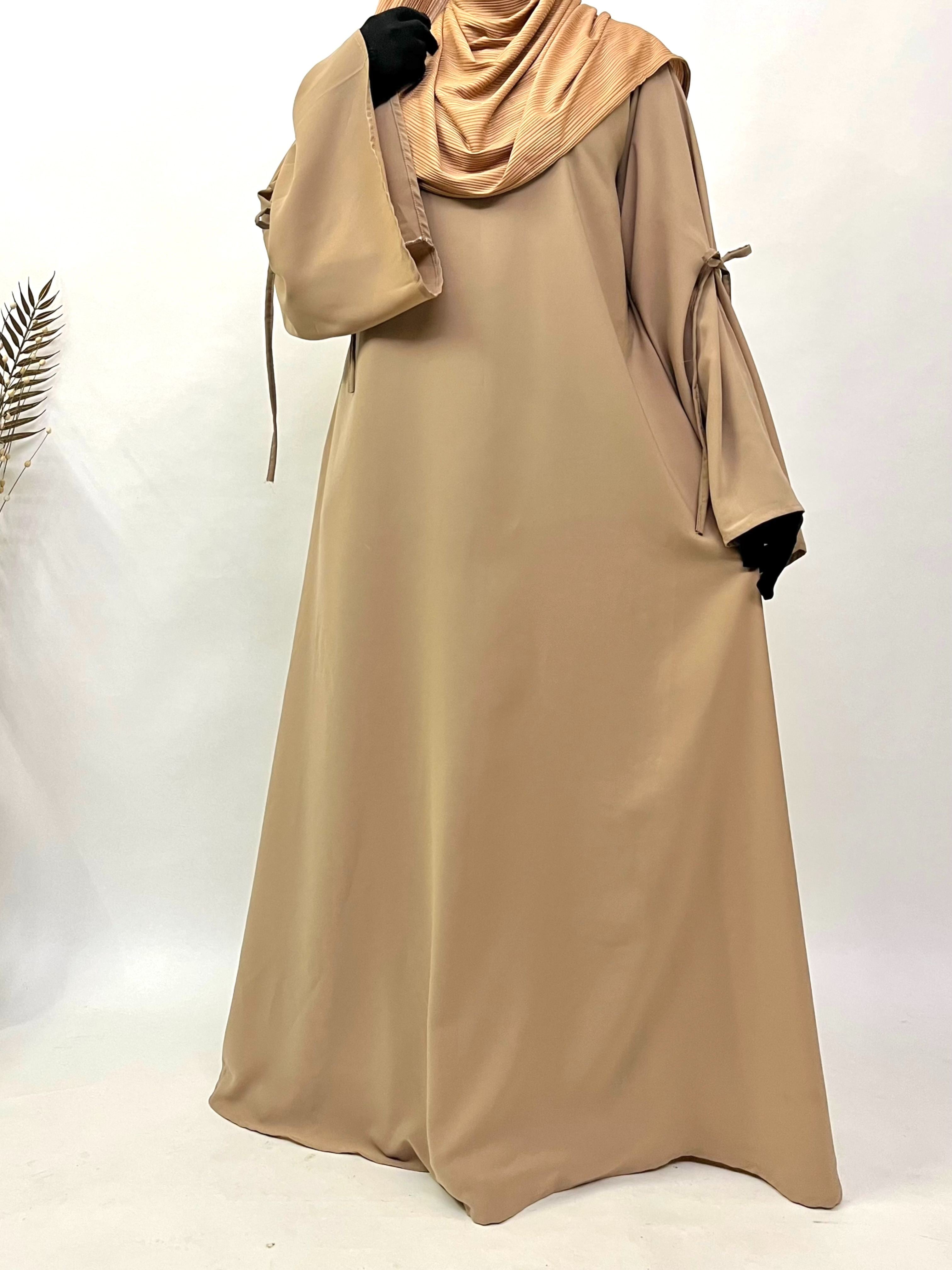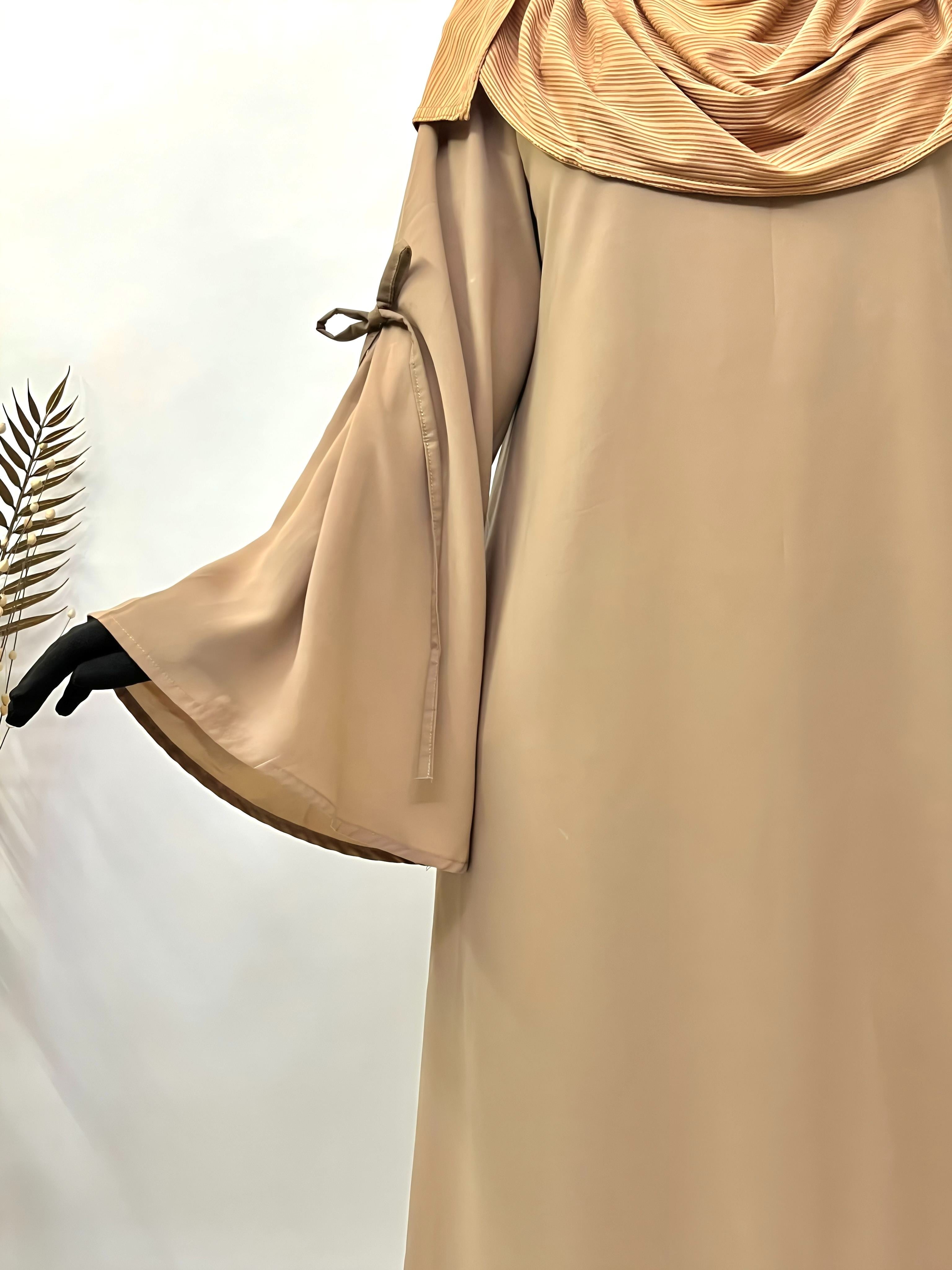 The Laiba Basic Abaya celebrates modest elegance with its distinctive bell sleeves finished with charming bows for ease of movement and convenient pockets on both sides. Designed to flatter and comfort, the A-line cut moves gracefully with you while maintaining a polished appearance. Complete your look with the included black georgette dupatta, finished with matching borders for a refined, coordinated appearance.