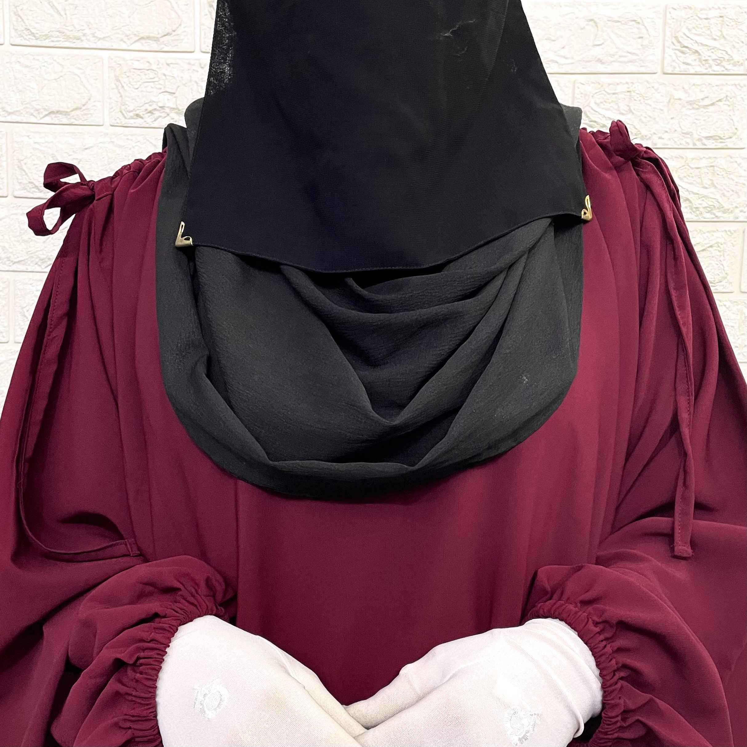 Maroon IQRA String Abaya offers elegant modest coverage with flary, elastic sleeves and tie strings on the shoulders for size adjustment. Say goodbye to shape reflections from any angle. Expertly designed for a perfect fit and ultimate comfort, it's the perfect addition to any modest wardrobe.