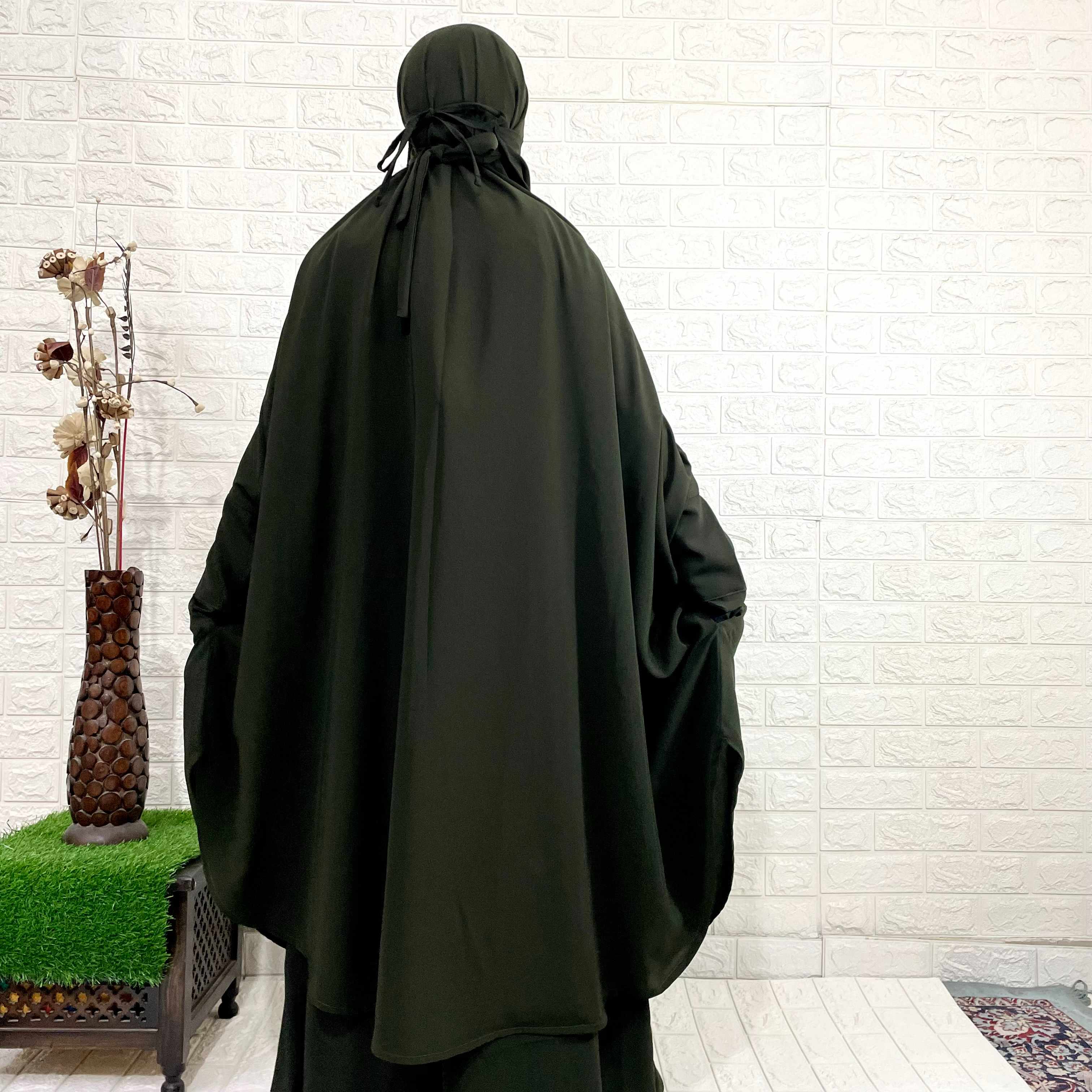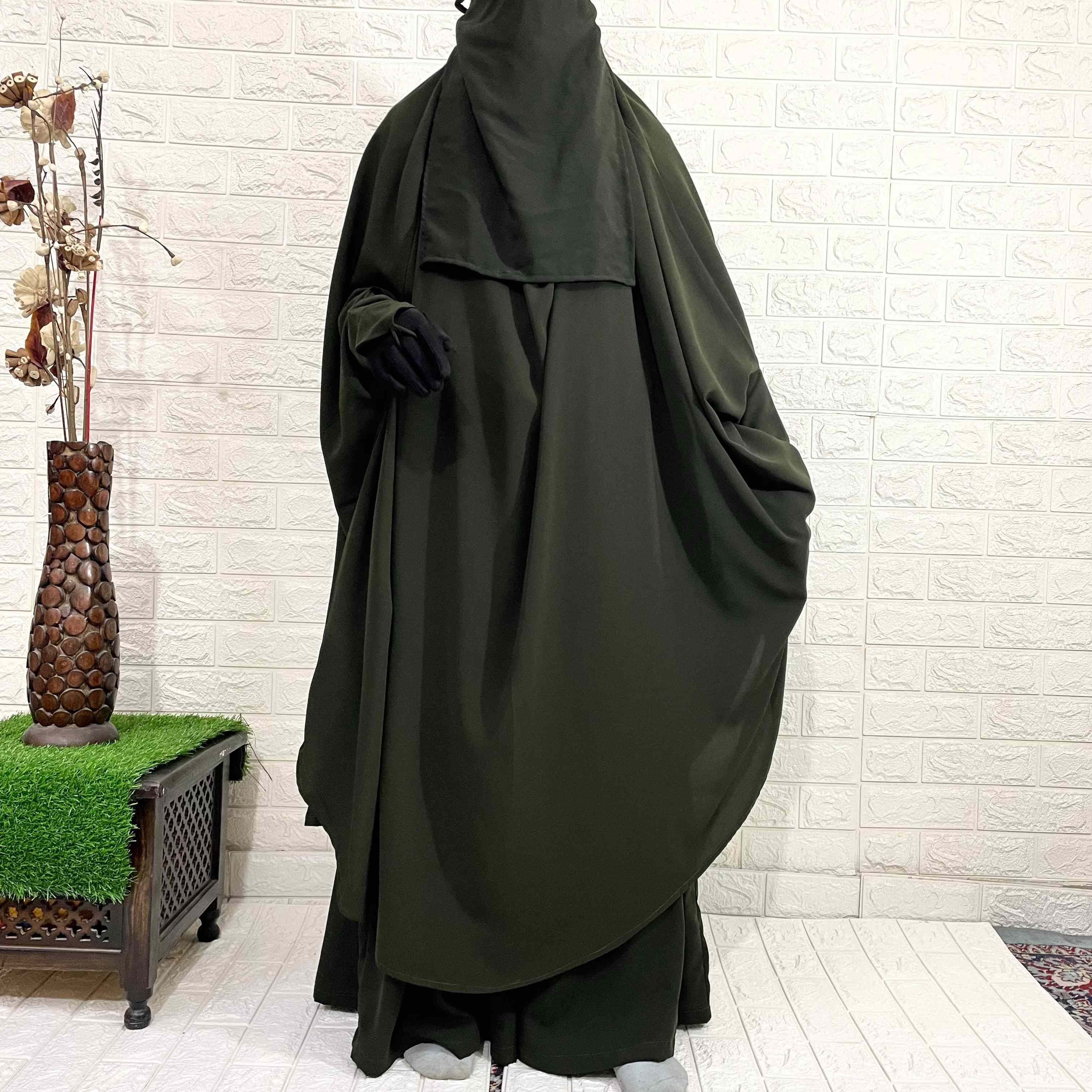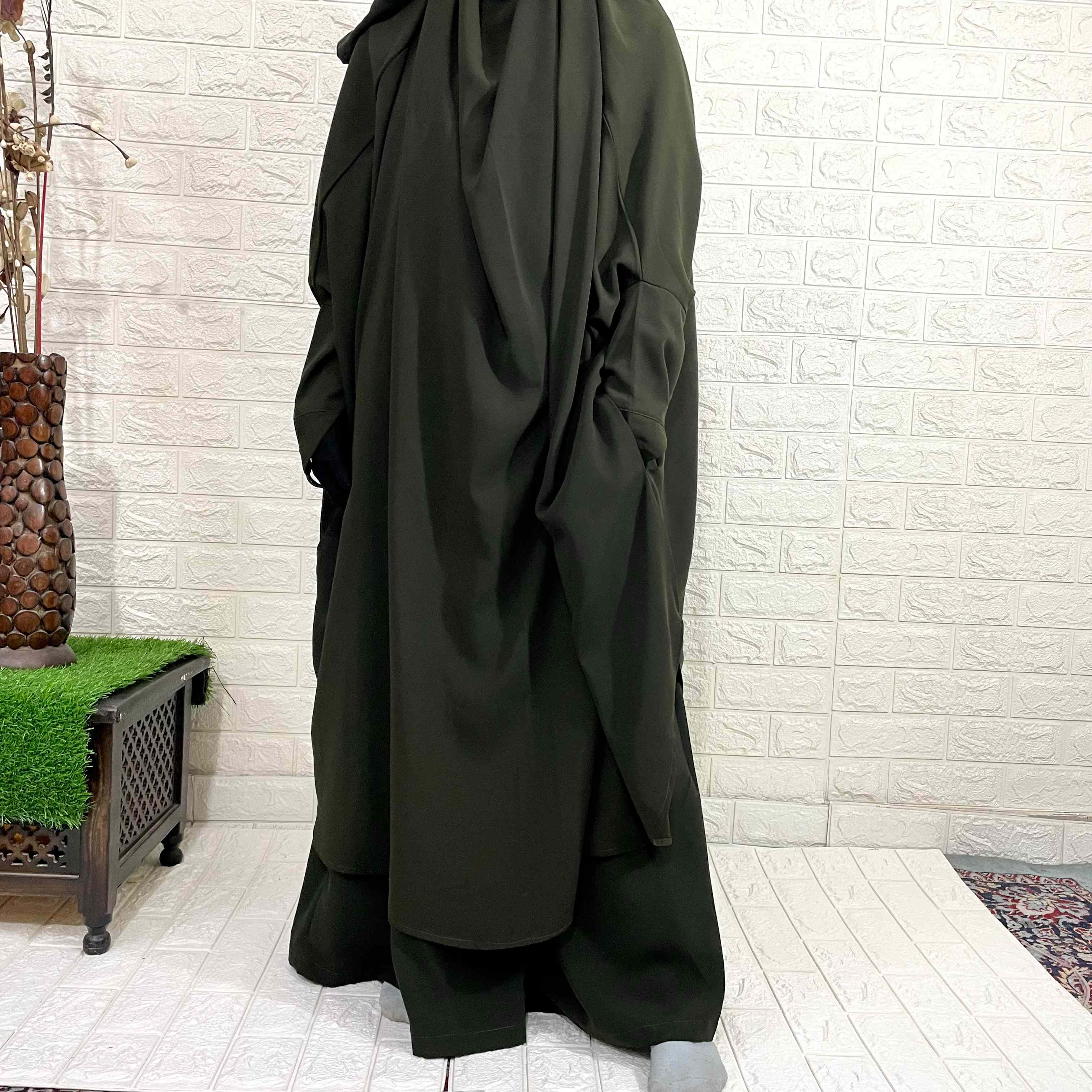 This Olive Green Two Pc Jilbab With Pant features a finger attachment and pockets, along with a flared bottom and comfortable broad pants. The loop sleeves add an extra touch of style and convenience.