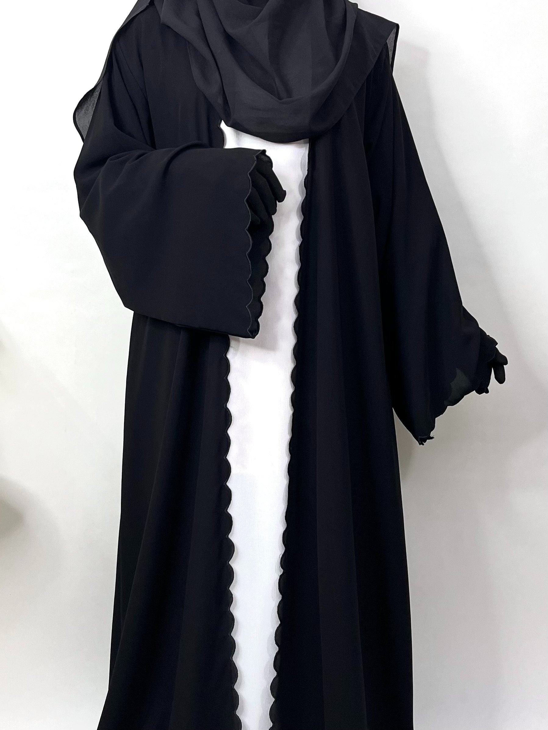 Experience understated elegance with this thoughtfully designed abaya, featuring a striking black outer layer paired with a crisp white inner piece. The delicate embroidered sleeves showcase refined craftsmanship, while the breathable, lightweight fabric ensures all-day comfort without compromising on style. Perfect for those seeking a versatile wardrobe staple that effortlessly transitions from daily wear to special occasions, this piece harmonizes aesthetic appeal with practical wearability in a single, graceful silhouette.
