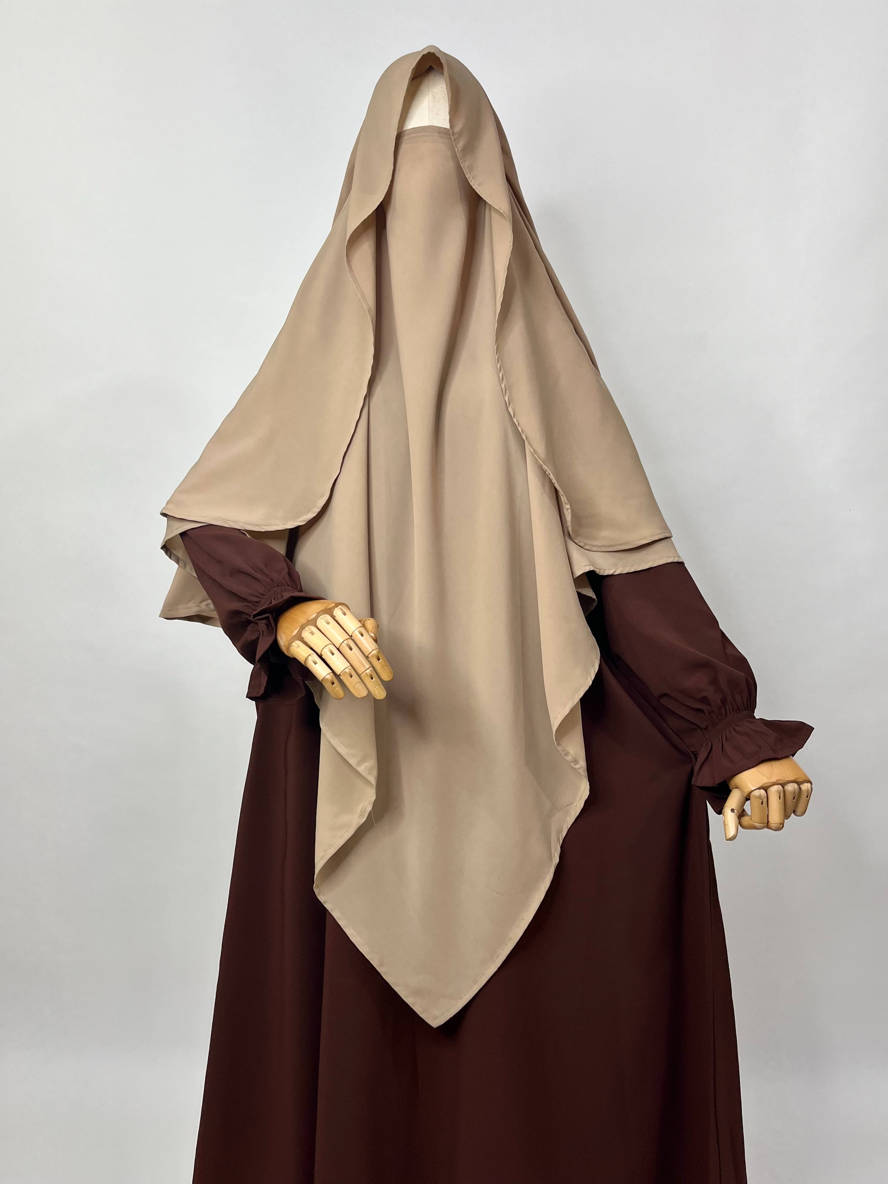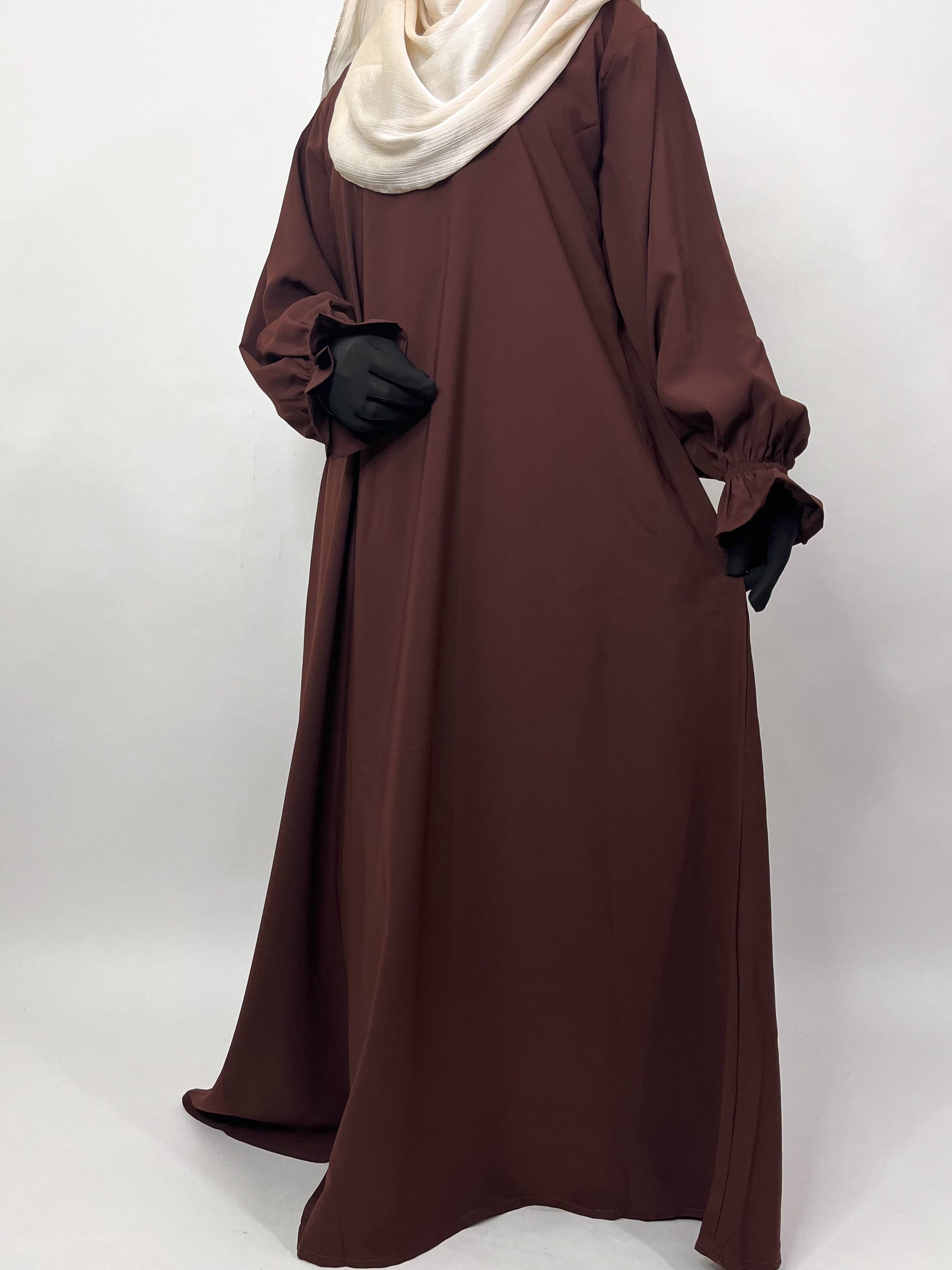 Brown Aline Abaya Khimar Set combines modesty and style with its flowy design and soft flower sleeves. It includes a flap beige diamond khimar that matches perfectly, making it comfortable for daily wear or special events while helping you feel confident and graceful.