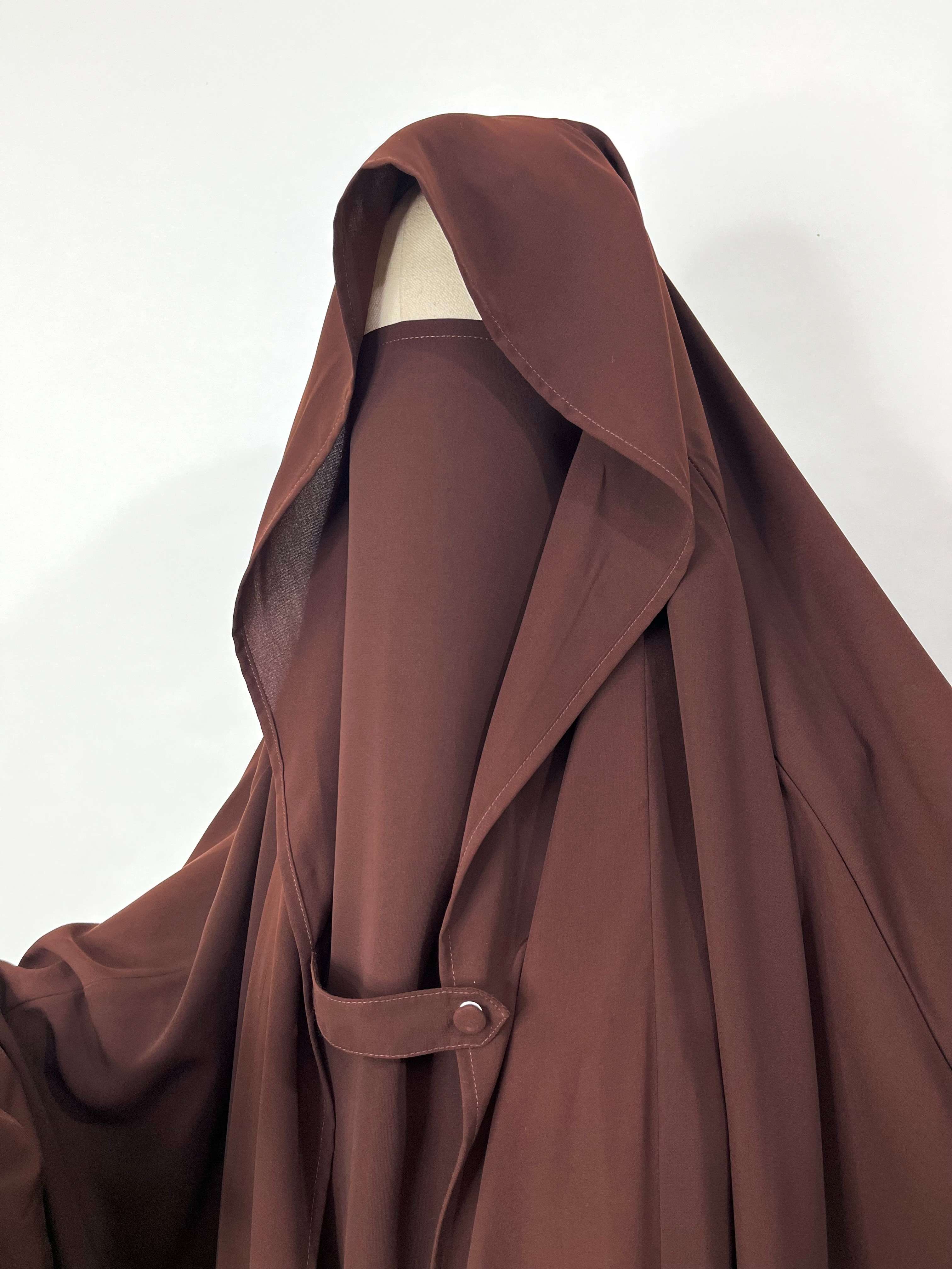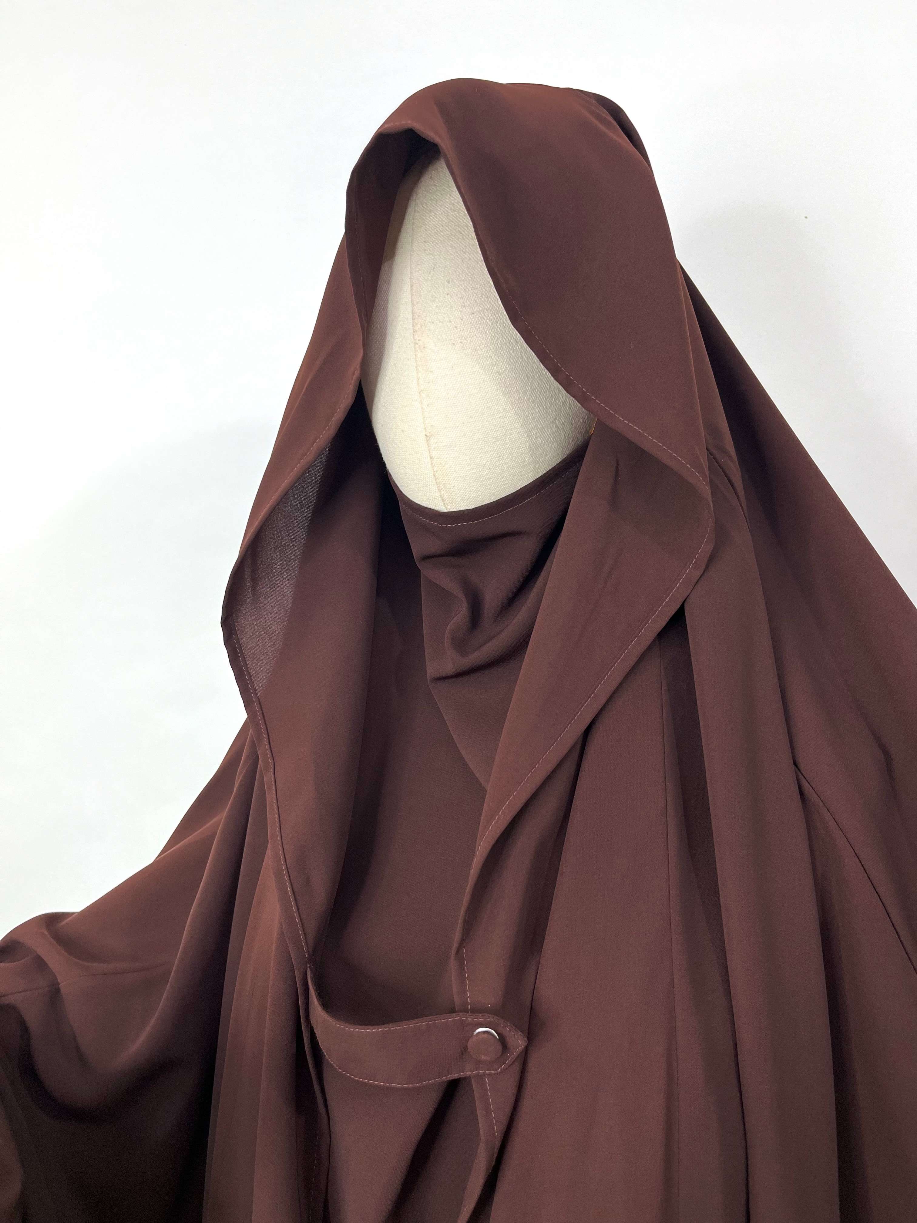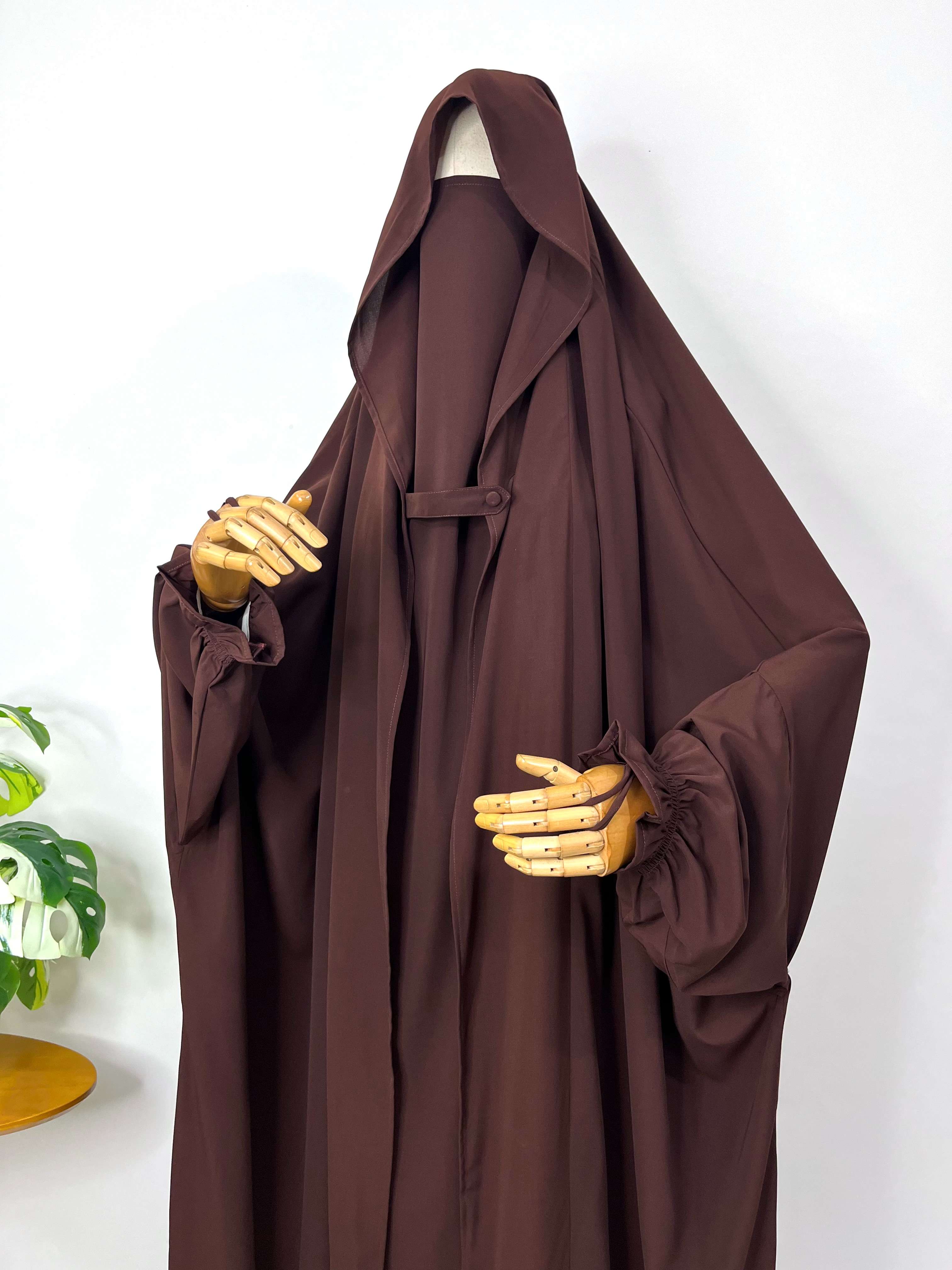 Introducing Brown Saudi Jilbab with flap - a modest and elegant choice for your wardrobe. This one pc jilbab features a convenient flap design and delicate flower sleeves with loops for added style and ease. Made from high-quality materials, it offers comfort and sophistication in one. Elevate your modest fashion with Saudi Jilbab.