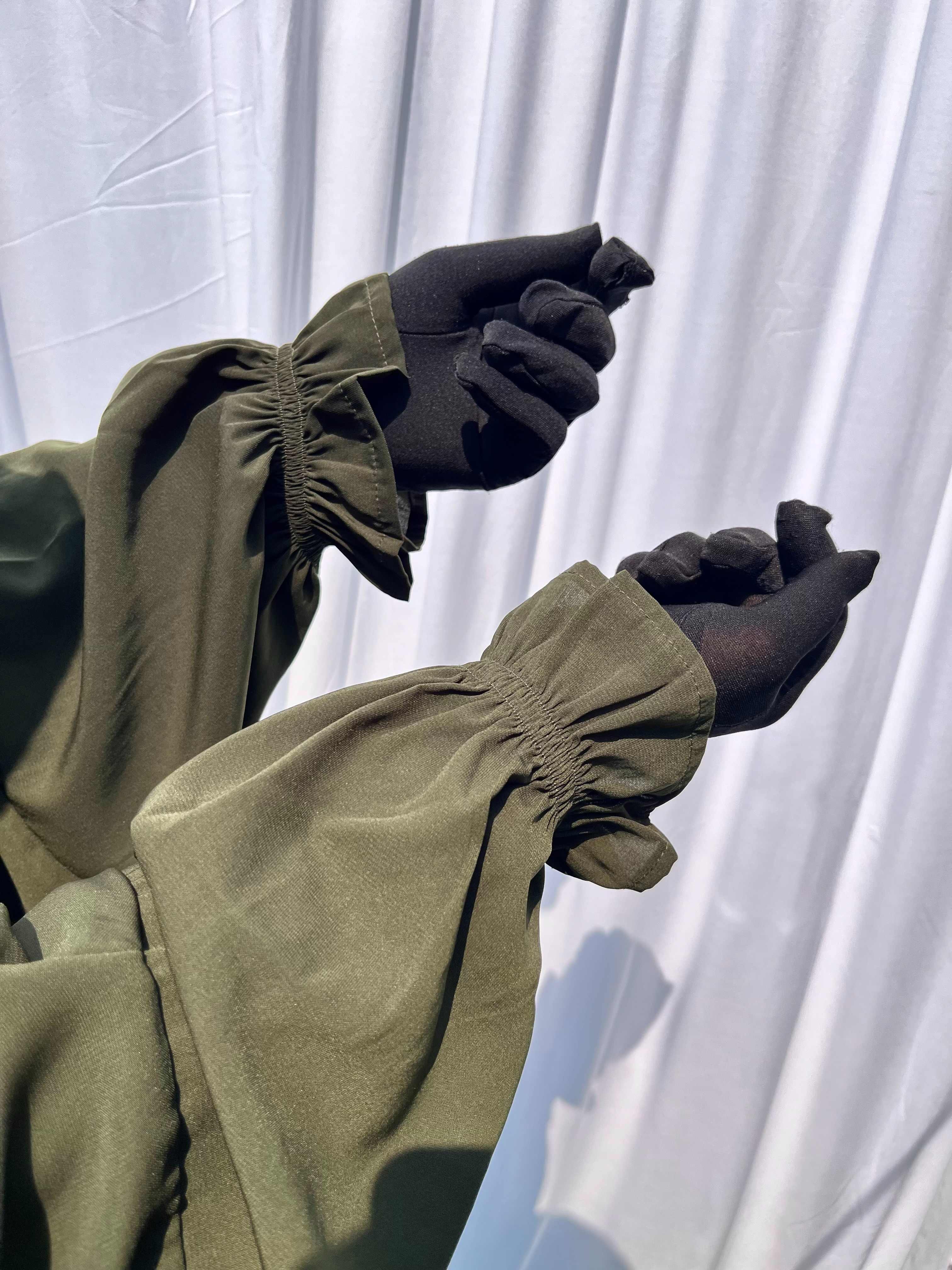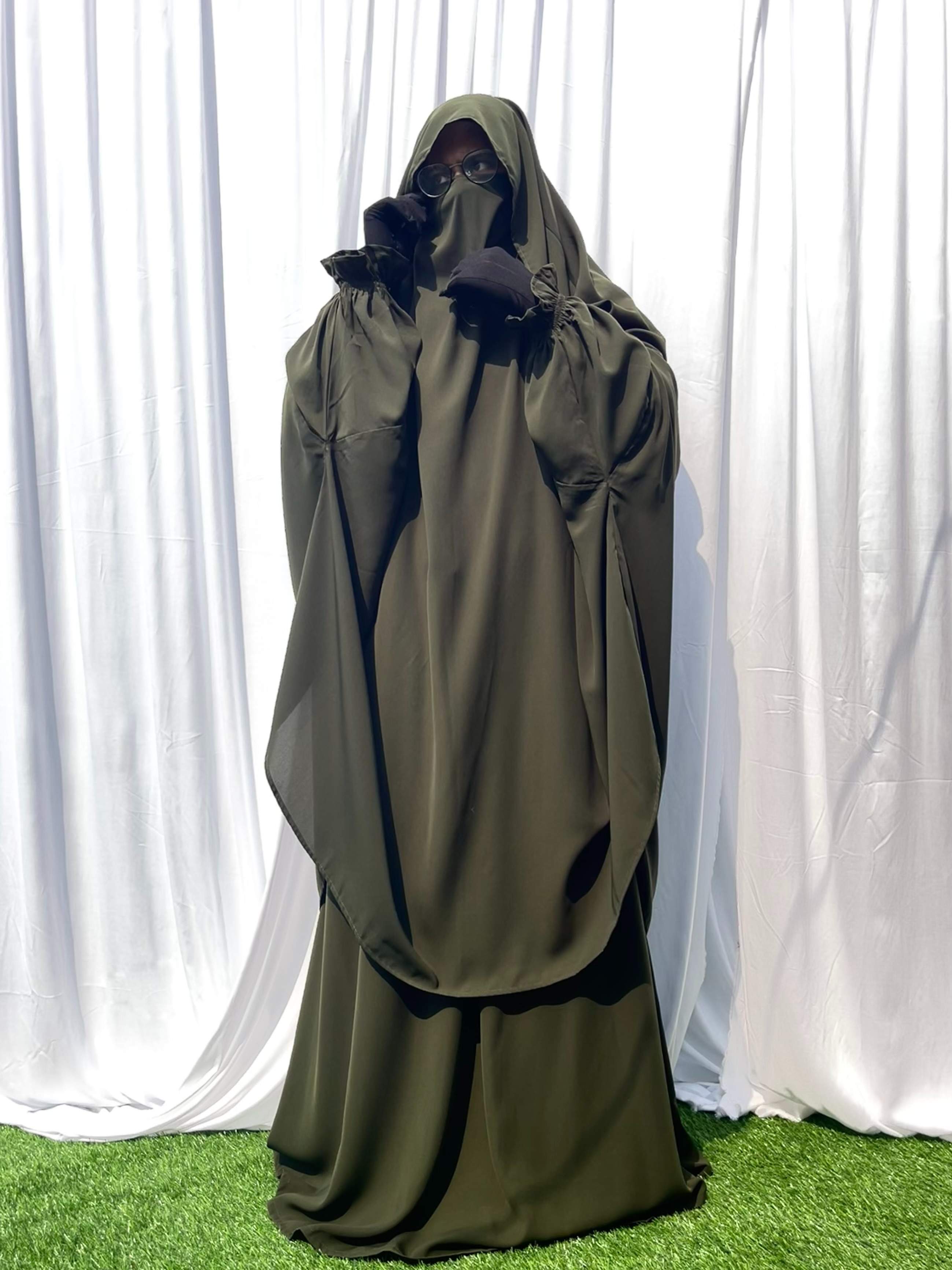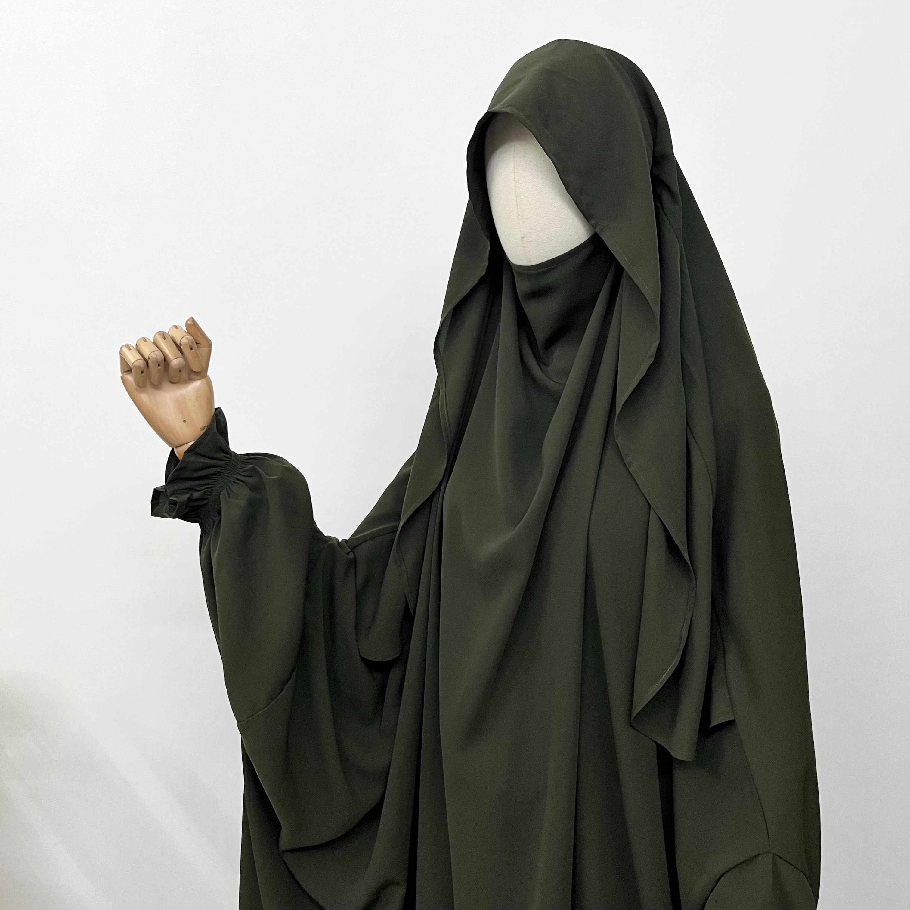 This Olive Two Pc Jilbab With Flap offers full coverage with a comfortable flap design. Featuring elegant flower sleeves and a flowing skirt, it combines modesty with graceful style. Perfect for those seeking both comfort and a refined look.