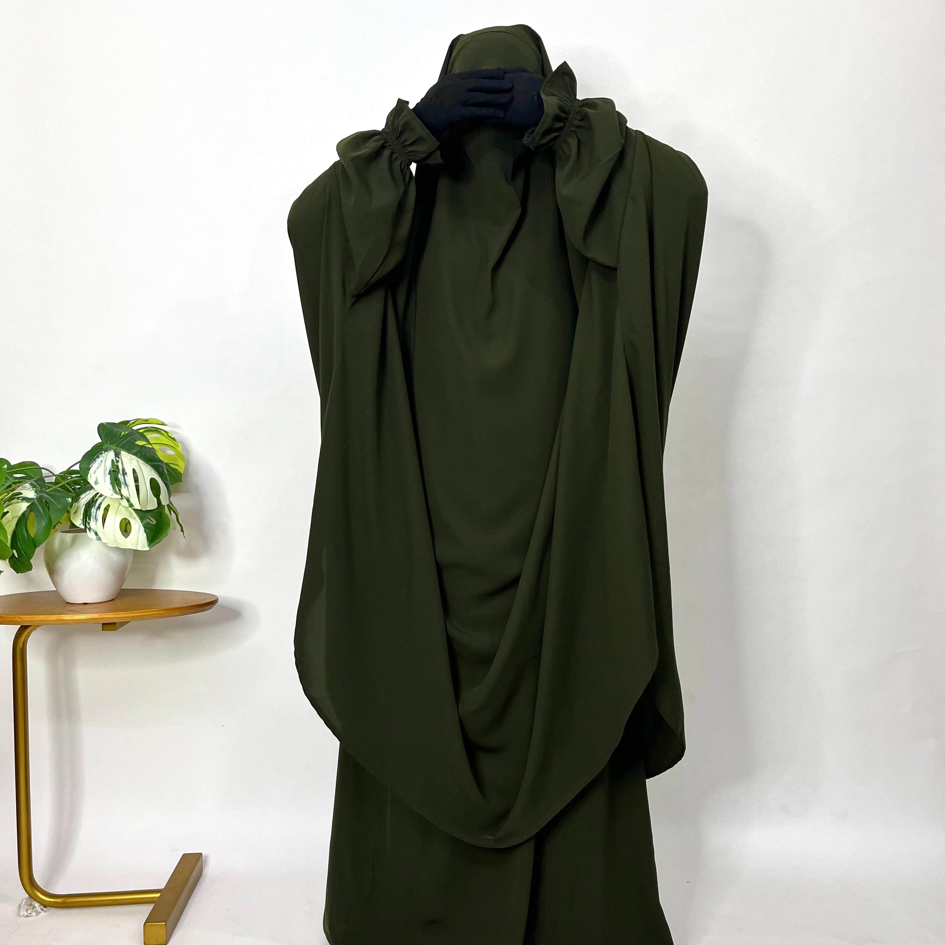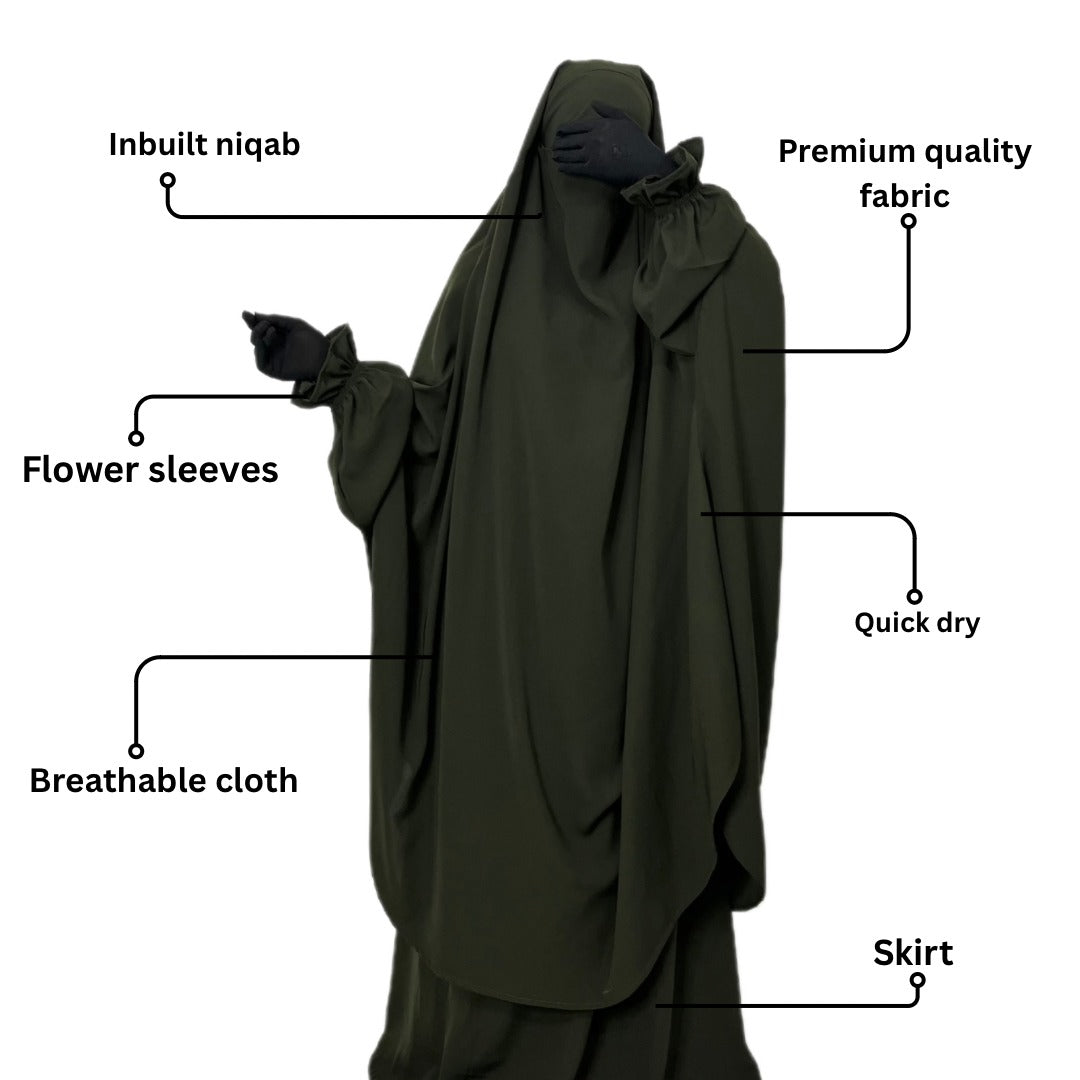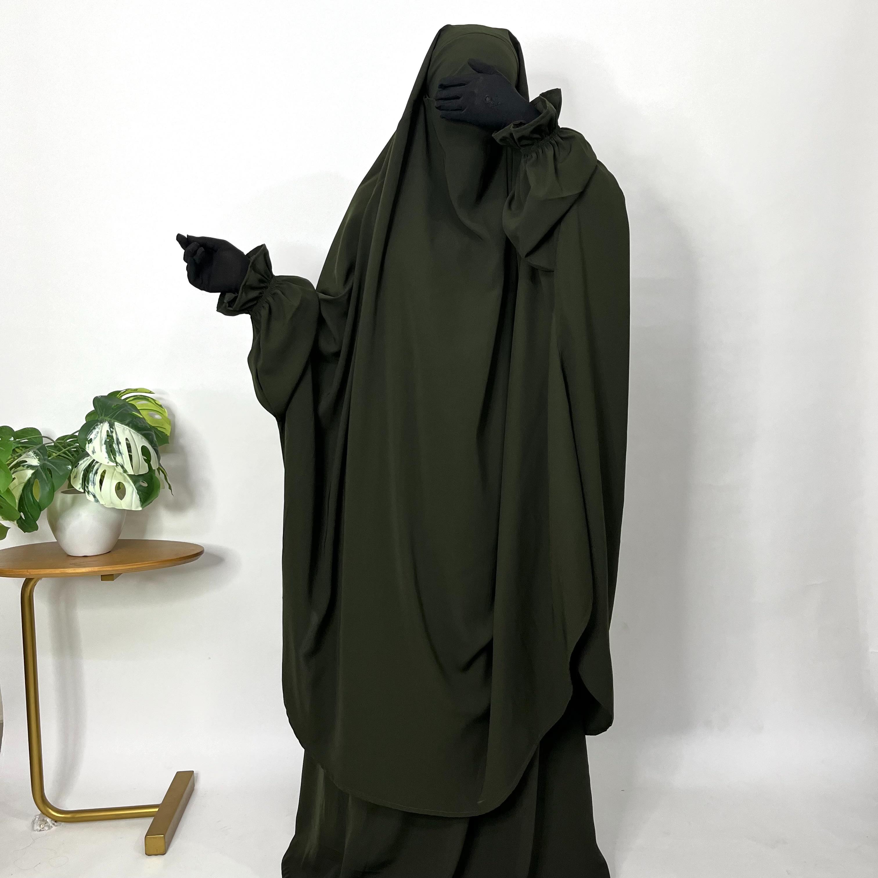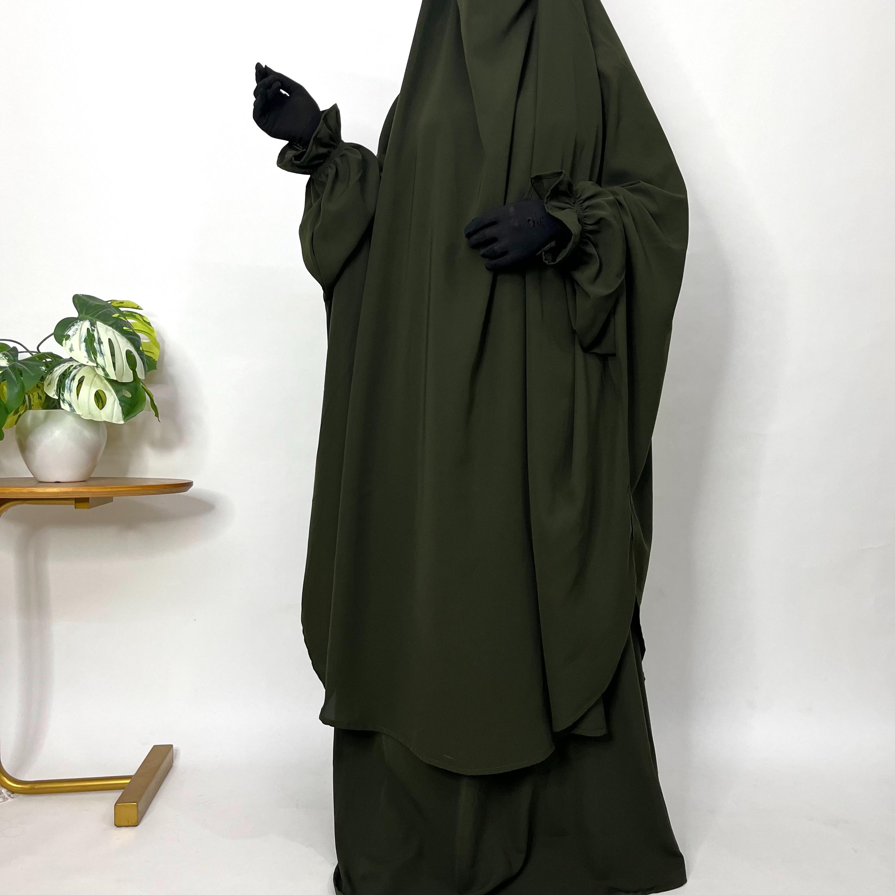 This two-piece jilbab and skirt provide complete coverage without sacrificing comfort. Enjoy looking elegant and feeling confident all day long.