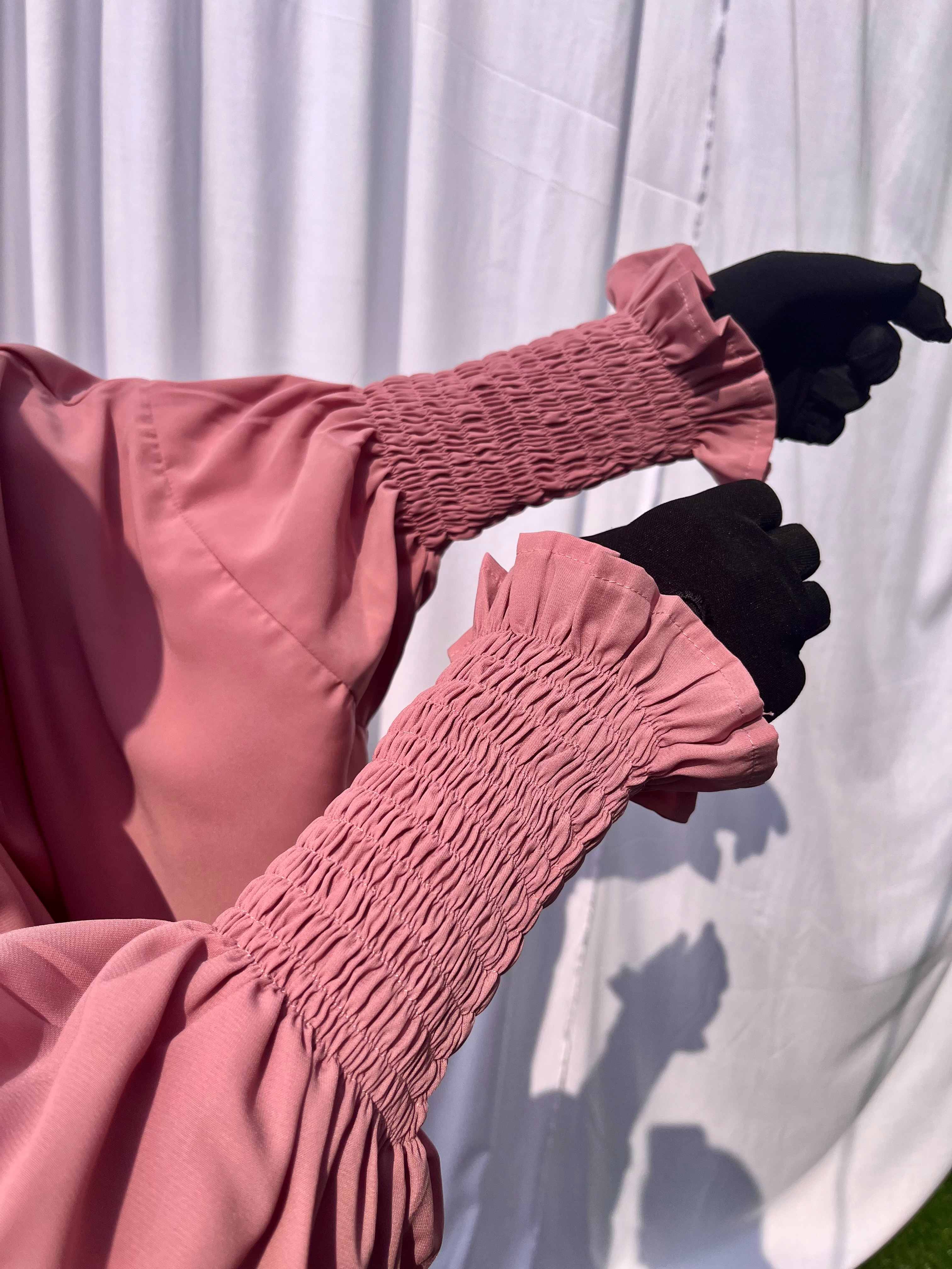 Stay stylish and modest with our Pastel Pink Two Pc Jilbab. This two piece set includes a skirt and a jilbab, providing full coverage while keeping you comfortable with smocking sleeves with flower. Perfect for any occasion, this jilbab allows you to stay true to your faith and fashion.