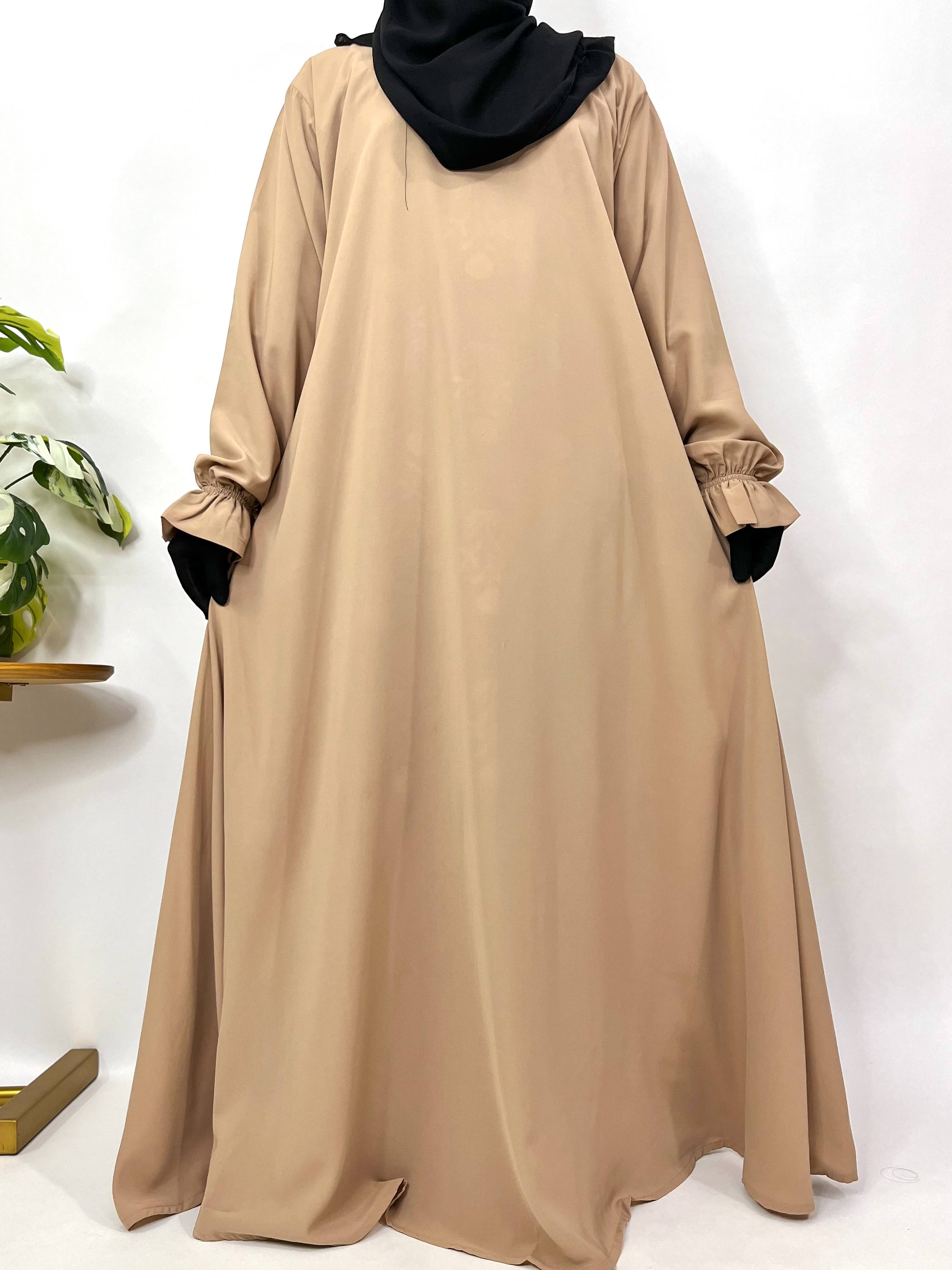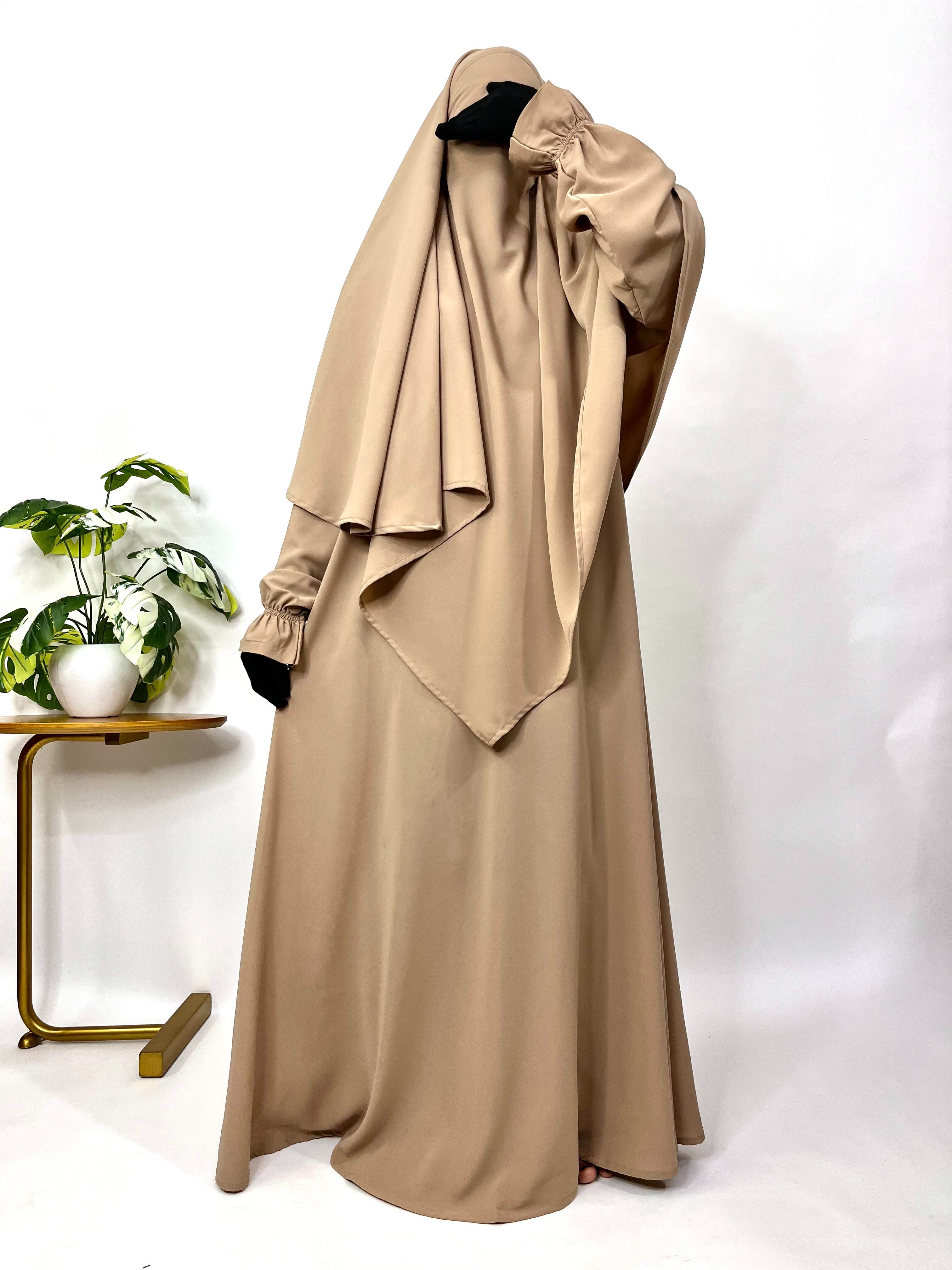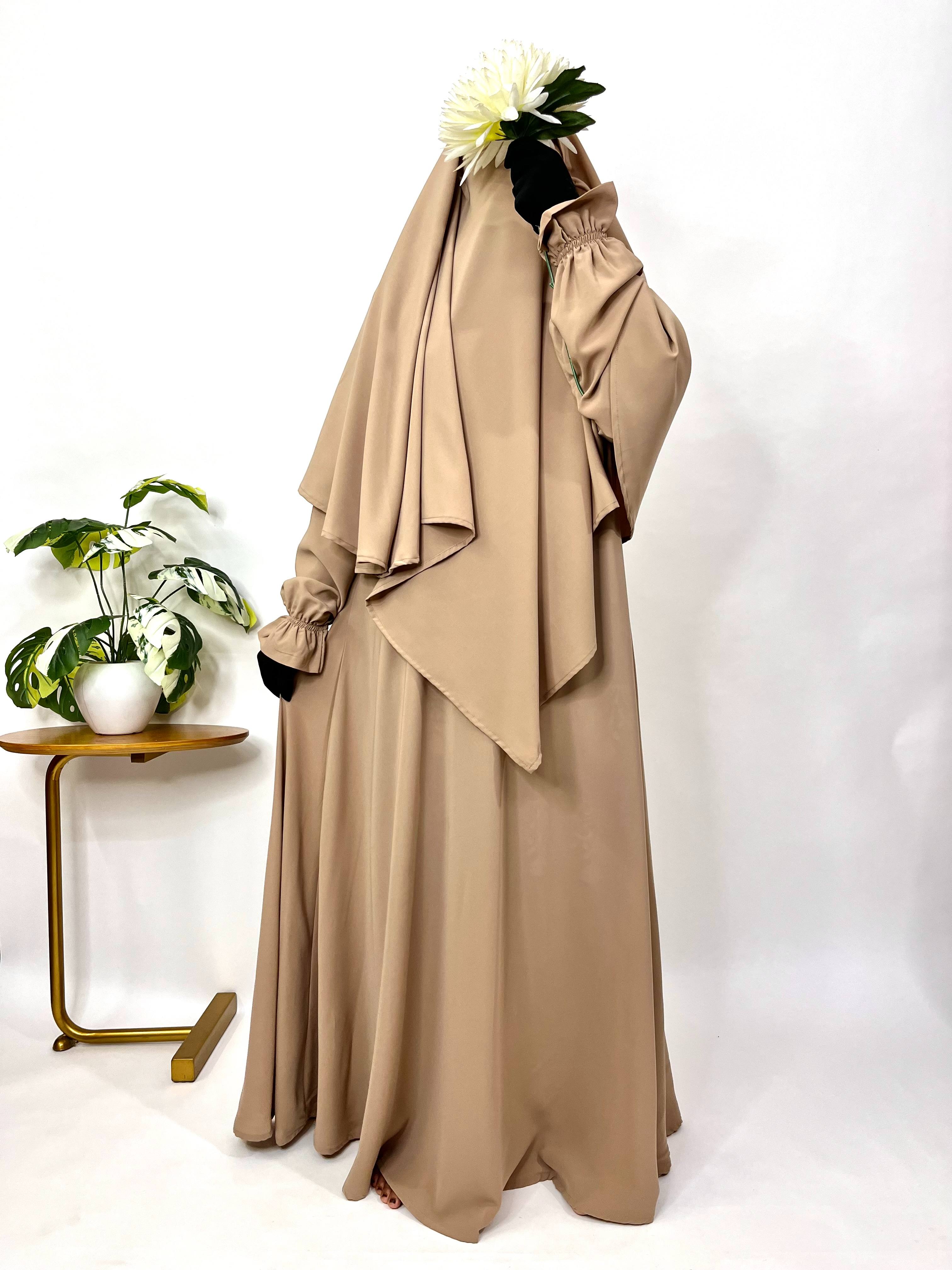 Beige Aline Abaya Khimar Set features elegant flower sleeves that add a delicate and feminine touch to your outfit. Designed for comfort and modesty, this set includes a beige diamond khimar that complements the flowing abaya perfectly. Ideal for everyday wear or special occasions, it offers a graceful silhouette that supports your confidence and style with ease.