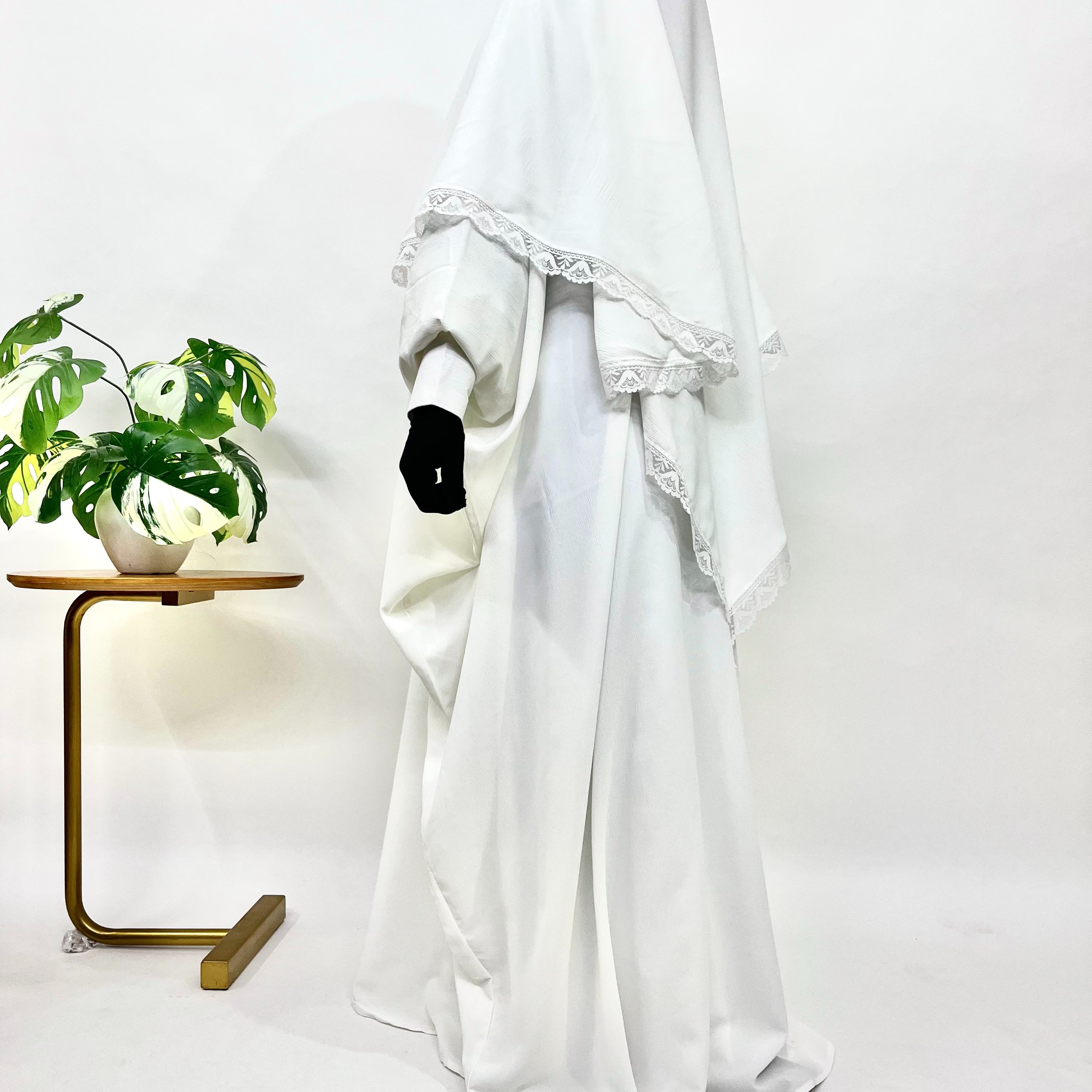 This White Kaftan Abaya featuring a Diamond/French Khimar is a free-size garment ideal for Hajj and Umrah. Combined with the coordinating khimar, it creates a unique and calming appearance. This set is an essential addition to your wardrobe for the season.