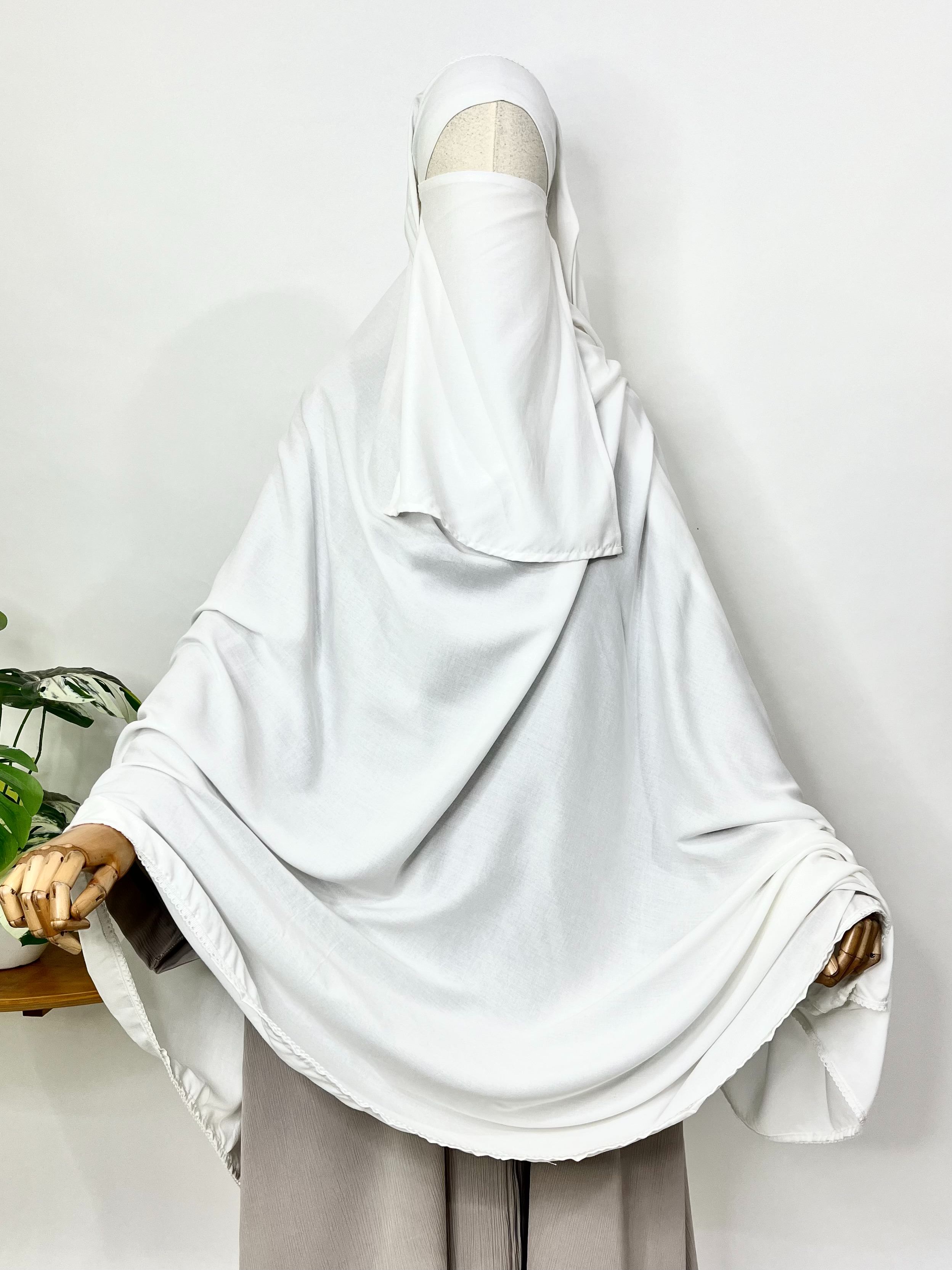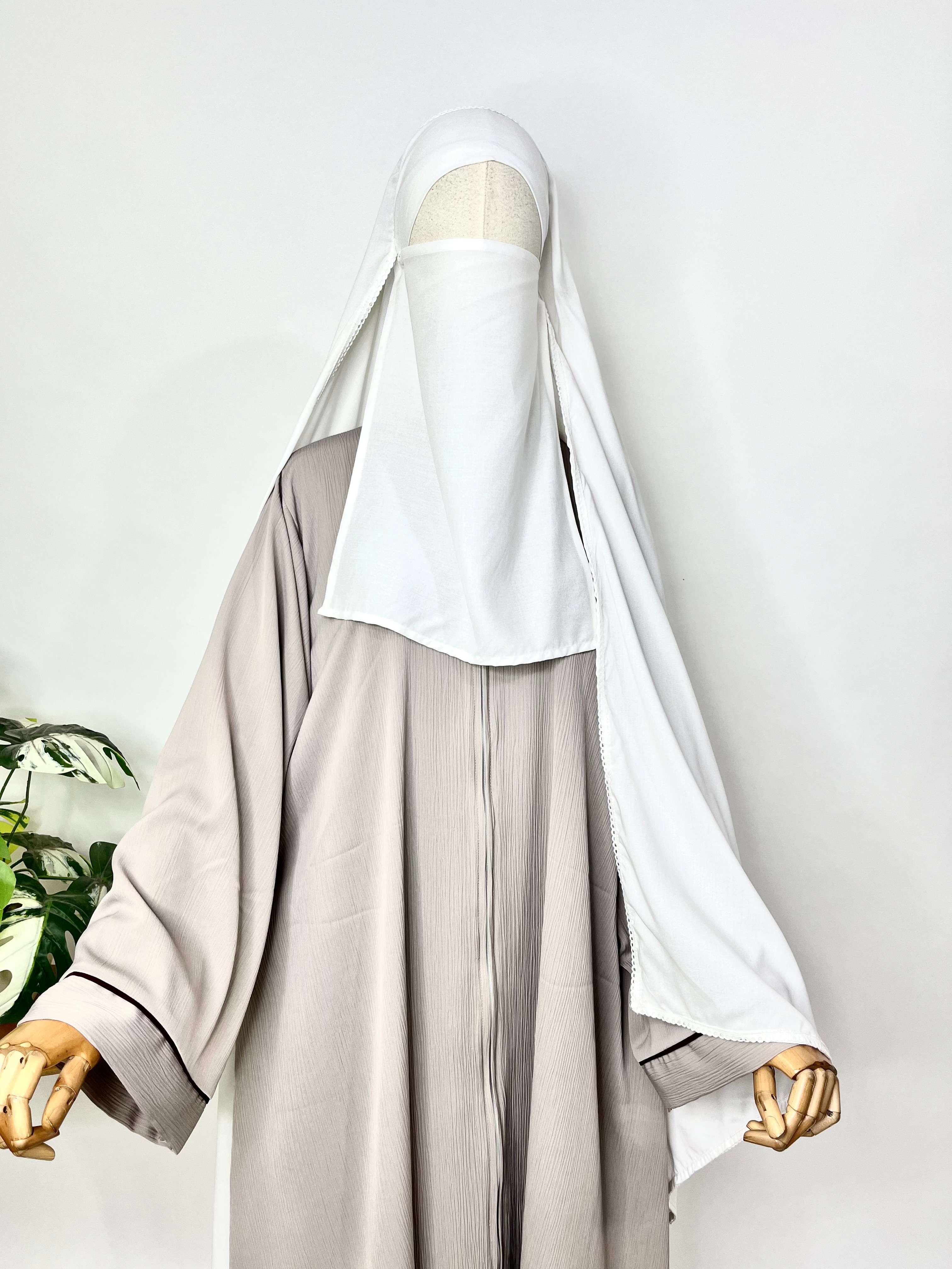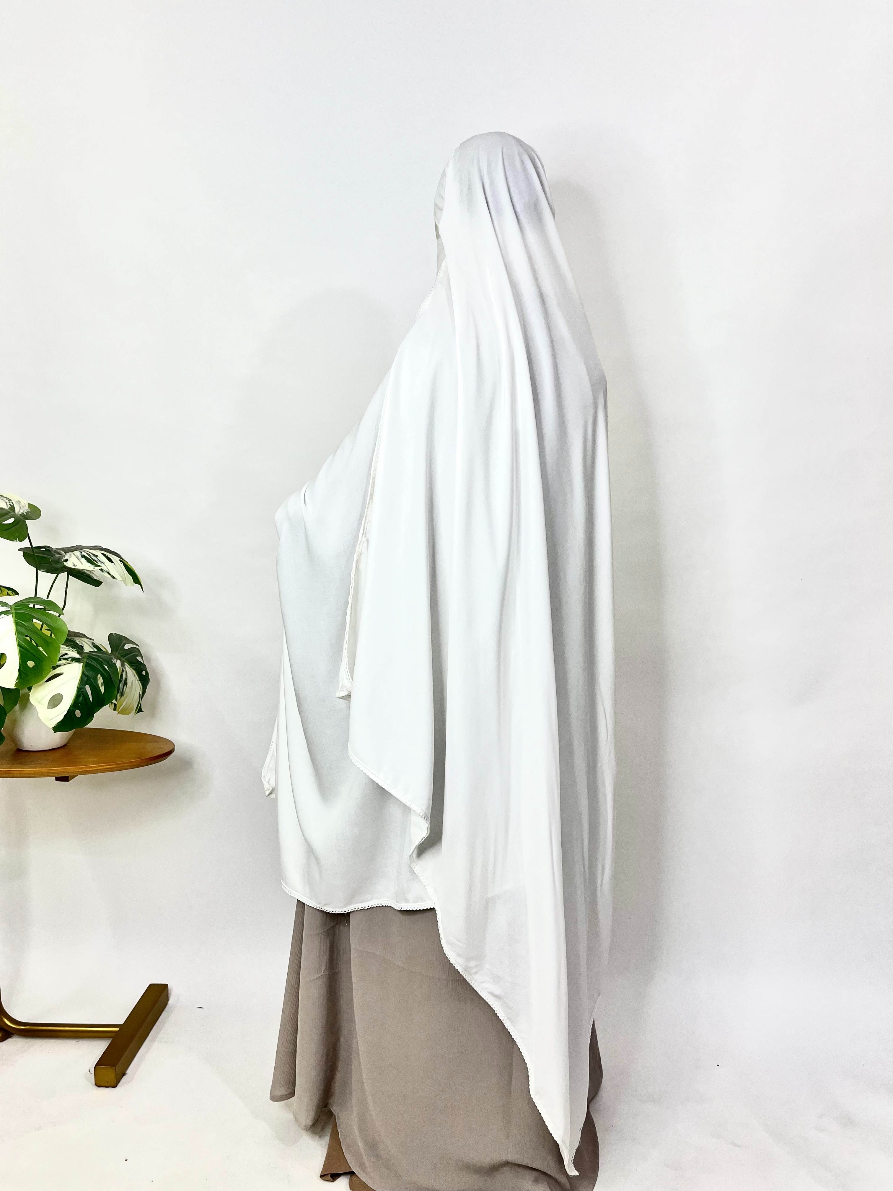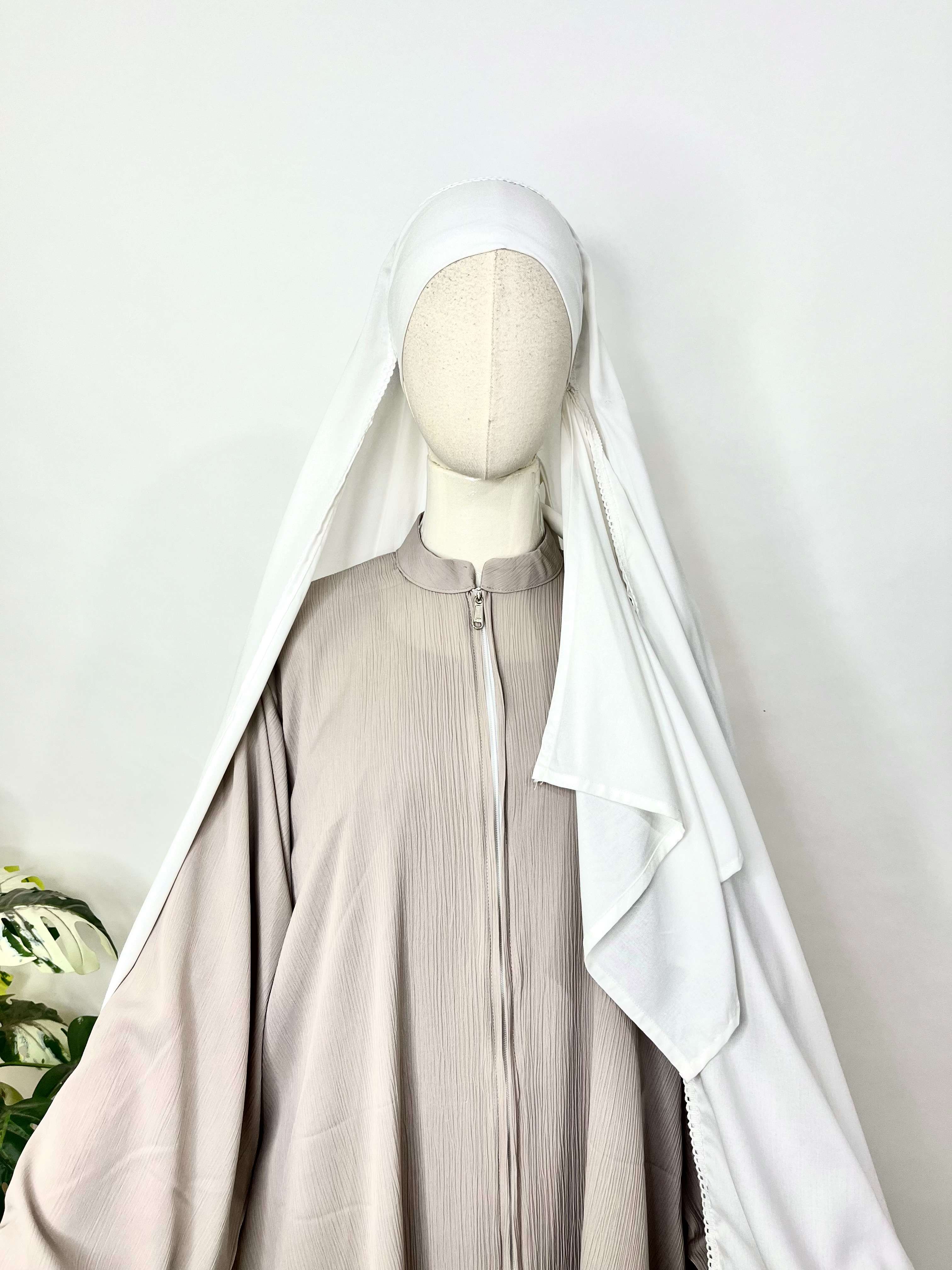 Embrace modest elegance with the White Pakeeza Chadar, a sleeveless front-open design that offers effortless layering for your everyday wardrobe. Featuring delicate side lace detailing that adds a touch of sophistication, this chadar combines style with practicality. The included nose piece ensures a secure, comfortable fit throughout the day. Perfect for those seeking graceful coverage without compromising on comfort or aesthetic appeal.