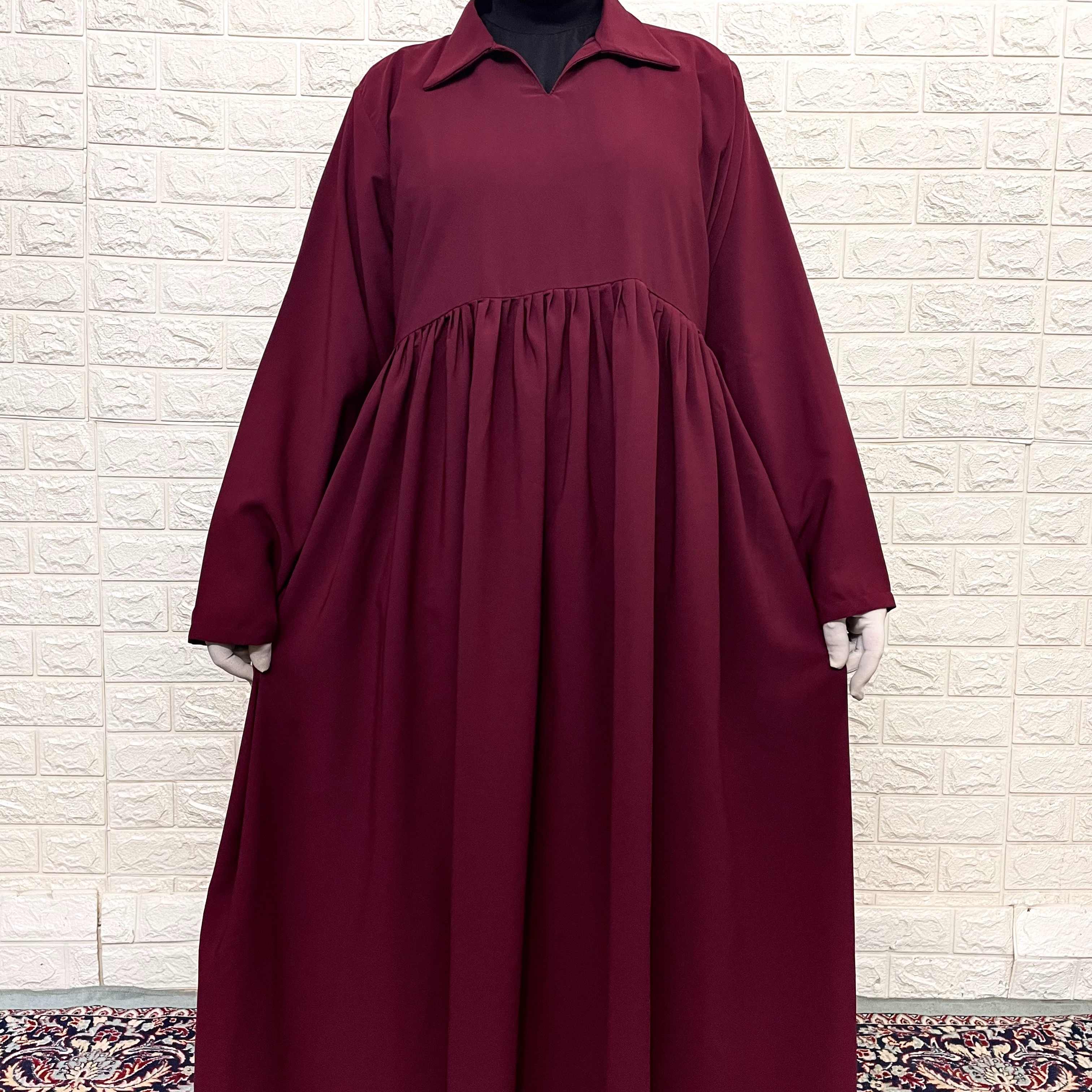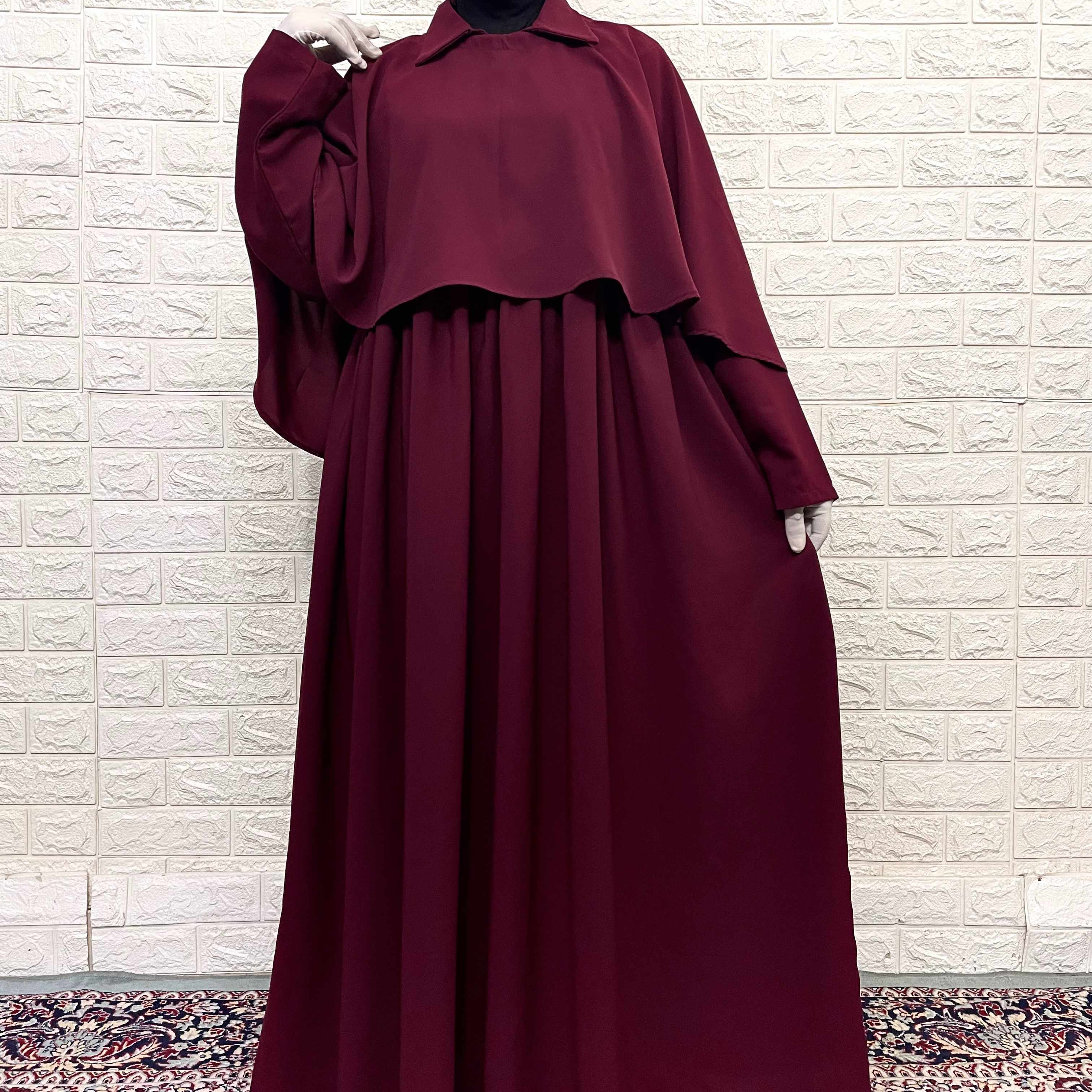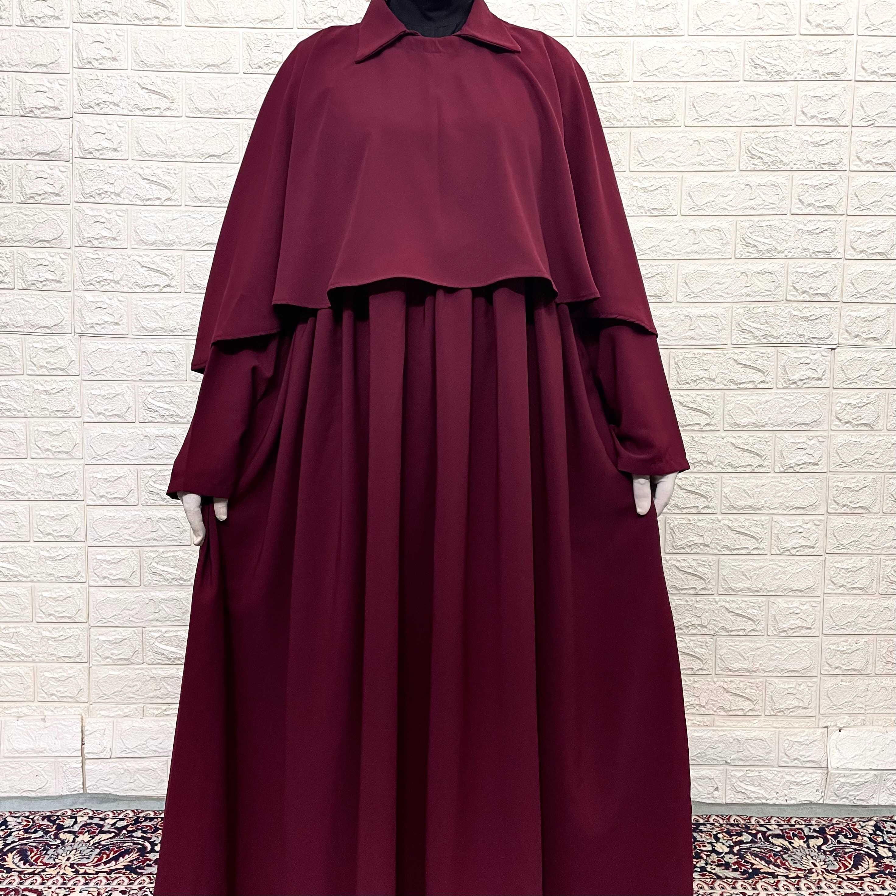 Embrace elegance with our Zeenat Abaya, a stunning maroon ensemble featuring delicate frills and a perfectly matched cape. This full set showcases a timeless classic collar design that exudes sophistication. The complementary cape drapes beautifully, enhancing the overall silhouette for a graceful, coordinated look that's both modest and fashionable.